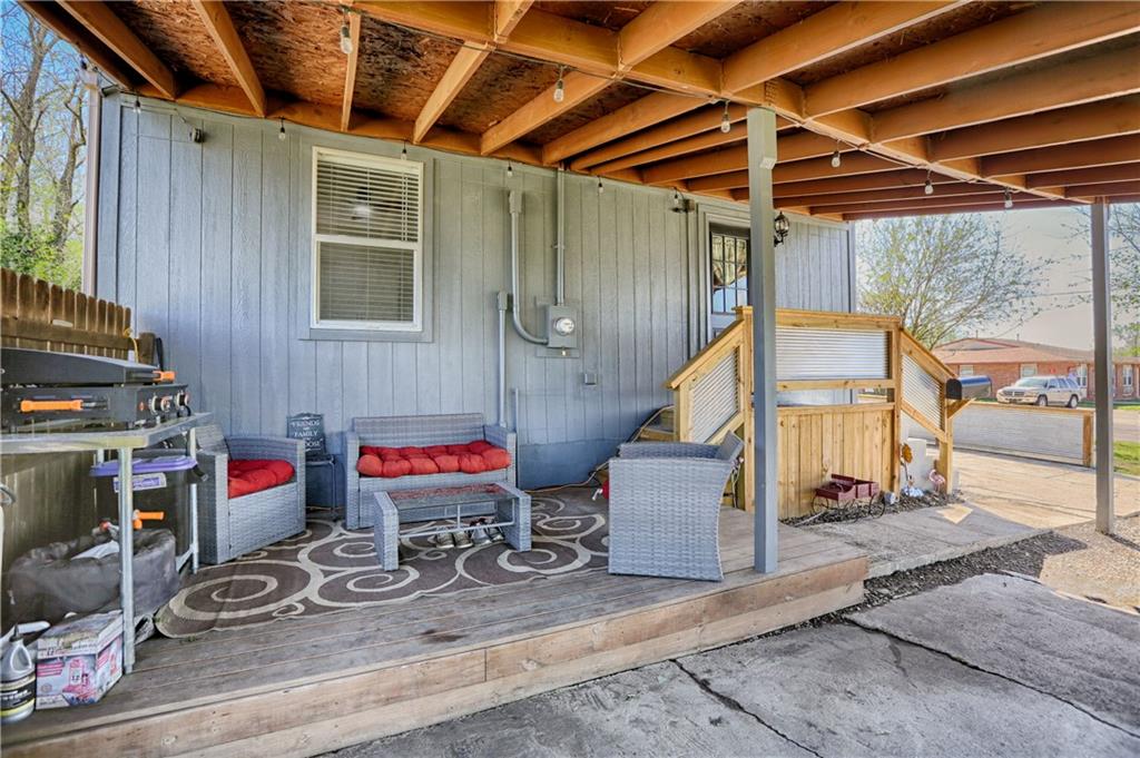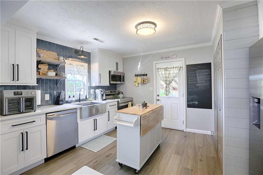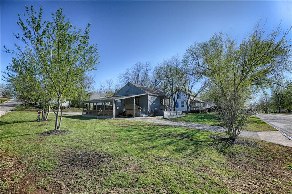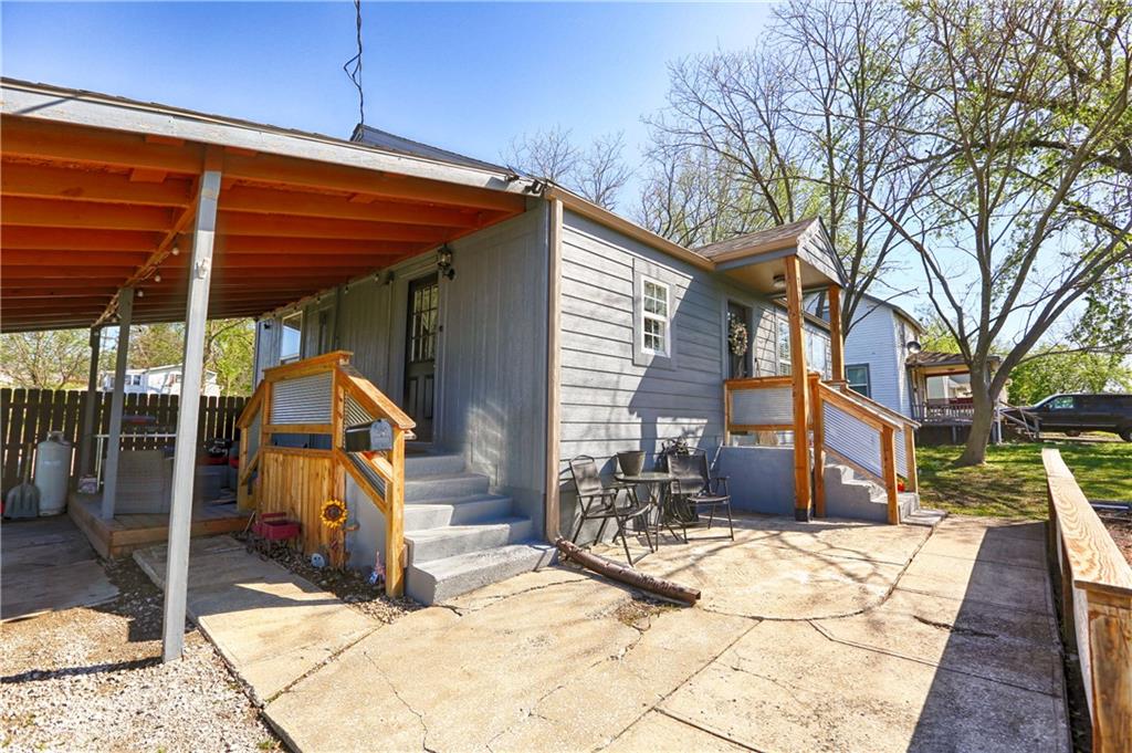 Recently renovated, this charming 2-bedroom, 1-bath home sits on a spacious corner lot(over a quarter of an acre) and features an oversized carport with additional parking behind the home. Updates include all new(er) siding, roof, gutters, doors, windows, HVAC, plumbing, and fully refreshed interior finishes. The kitchen is thoughtfully designed with extra-tall, soft-close cabinetry, quartz countertops, tile backsplash, open shelving, a built-in pantry, large stainless steel sink and bar seating. Stainless steel appliances complete the space. The open-concept living area is filled with natural light and features a cozy built-in fireplace. Durable, waterproof luxury vinyl flooring runs throughout the main living spaces for easy maintenance. The bathroom offers generous space and additional storage, while both bedrooms include carpet, ceiling fans and window treatments. All window treatments are included. Outside, the oversized carport doubles as an inviting entertaining space with an attached deck and ample sized shed for additional storage. The large corner lot is conveniently located near the Flint Hills Trail and a nearby sports complex. Don’t miss the opportunity to make this move-in-ready home yours—schedule a showing today!