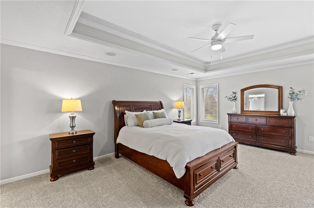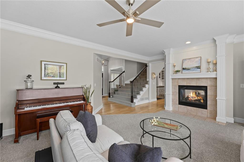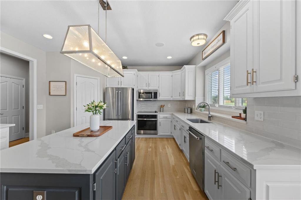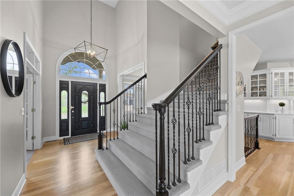 Stunning Remodeled Two-Story in Prime Wellington Park Location Welcome to this beautifully updated two-story home nestled in the highly sought-after Wellington Park community. Lovingly renovated inside and out, this residence combines timeless elegance with modern upgrades, offering exceptional living spaces for today’s lifestyle. Step inside to discover newly installed hardwood floors, fresh interior paint, and plush new carpeting throughout the main level. The heart of the home is the incredible chef’s kitchen, featuring newly painted cabinetry, gorgeous Calacatta quartz countertops, a stylish tile backsplash, a walk-in pantry, and brand-new stainless steel appliances. The adjoining hearth room showcases a striking two-sided fireplace shared with the formal living room, creating a warm and inviting atmosphere. A formal dining room, dedicated home office, and convenient main-level laundry room complete the first floor. Upstairs, you’ll find four spacious bedrooms and three full bathrooms, including a luxurious primary suite. This private retreat boasts a coffered ceiling, a separate sitting room with its own fireplace—perfect for a study or relaxation space—and a spa-like en-suite bath with dual vanities, a jetted tub, and an enormous walk-in closet. The finished walkout lower level is filled with natural light from large windows overlooking the lush backyard. It offers a generous recreation room ideal for entertaining, along with a bonus non-conforming fifth bedroom, perfect for guests, a home gym, or additional office space. Enjoy outdoor living on the expansive deck that overlooks the private, beautifully landscaped yard. Located within the award-winning Blue Valley School District and just minutes from premier shopping, dining, and major highway access, this home offers both luxury and convenience. Don’t miss this exceptional opportunity to own a move-in-ready home in one of the area’s most desirable neighborhoods!