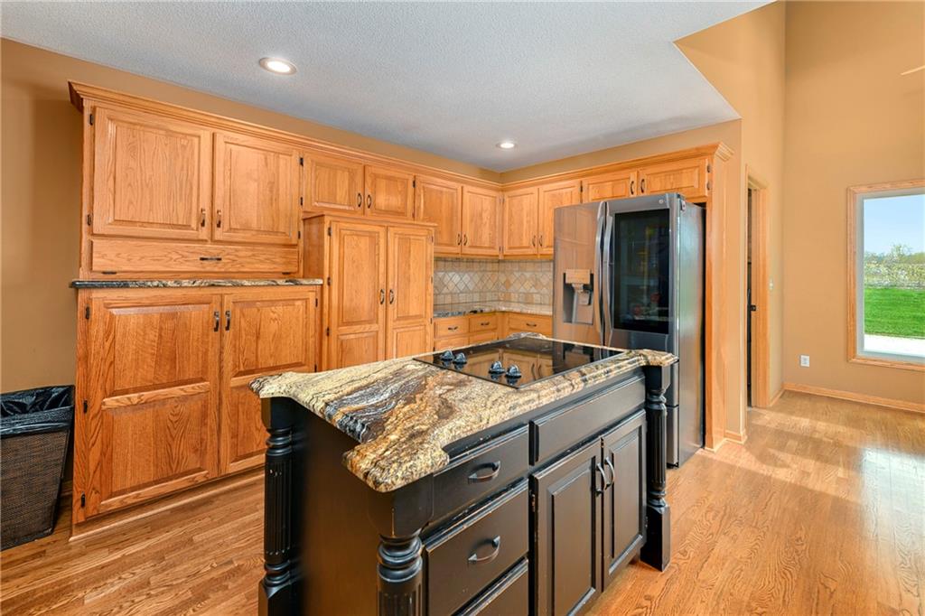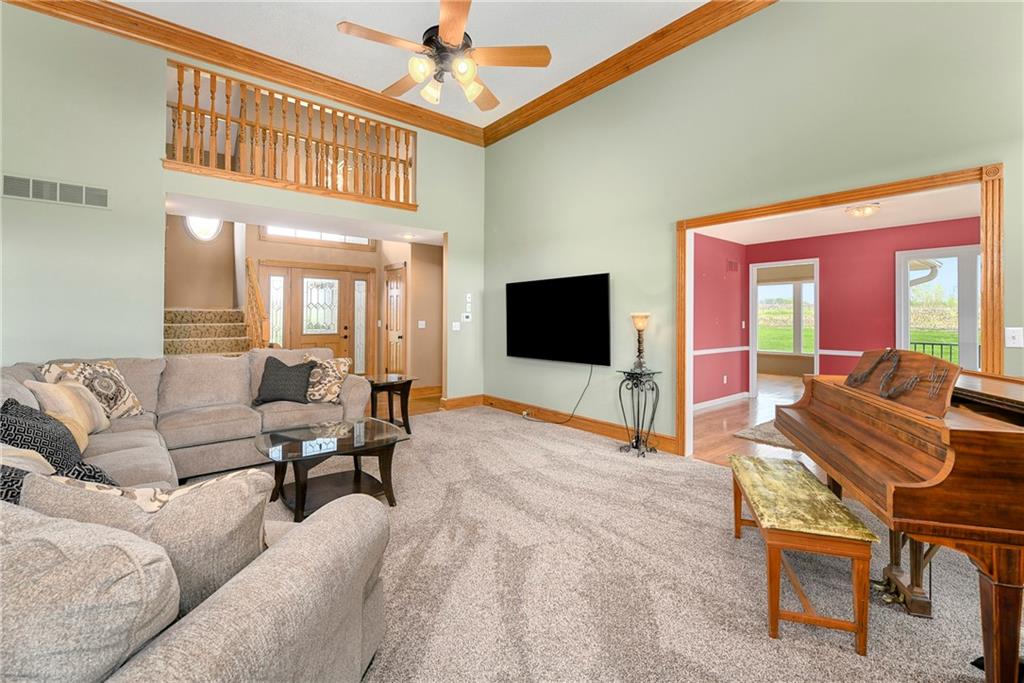 Escape to the peace of the countryside in this custom built home on 24 acres. A fully stocked pond with Bass, Crappies, Perch, Bluegill, and Catfish provides the perfect place to relax while watching the sun set. The entry opens to a large great room with heat circulating wood burning fireplace and 13' ceilings with beautiful crown moulding. There are two dining areas (one is currently being used as an office). The kitchen has many cabinets, pantry, island with cooktop, Granite countertops, tile backsplash, and wood floor. The primary suite is large and includes the following amenities - a double vanity, shower, whirlpool tub, linen closet, and walk-in closet. The two upstairs bedrooms are generous size with a shared bathroom. There is an office that could be converted into another bedroom/play area/craft room - the options are endless. There is a storage area above the garage off one of the bedrooms. The finished walk-out lower level has so much to offer with large family room, gym/exercise room (could be converted into a bedroom), full bath (with walk-in closet for guests), storage area (16.11x11.6), and 3rd car garage (14.3x11.2). The home was remodeled in 2008 with new vinyl siding, windows, roof, granite countertops, & refinished hardwood floors. The 60x40 outbuilding includes 100amp electrical service, insulated interior, concrete floor, water, radiant heat, pegboard/workbench, large overhead door for RV, & BONUS - 9,000 lb vehicle lift. There is a lean-to (40x12.6) on the back of the outbuilding. Located just a little under 10 minutes from I-70, this property offers the perfect balance of rural privacy and convenient access to town and Kansas City. Inspections welcome but selling "AS IS". The two gas tanks on the East side of the outbuilding are not staying.