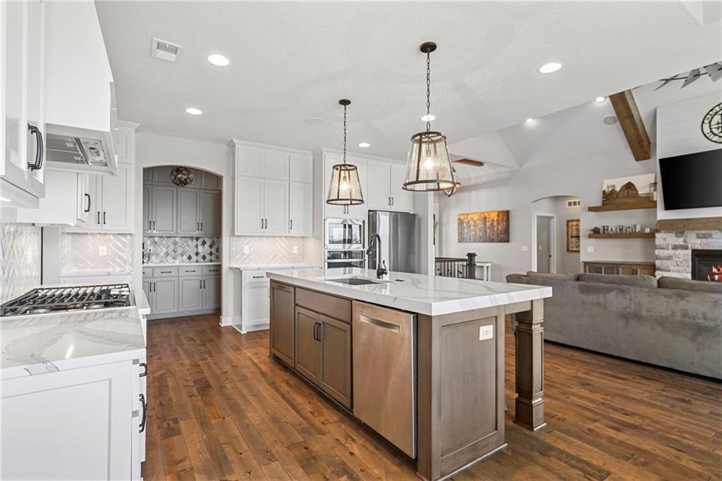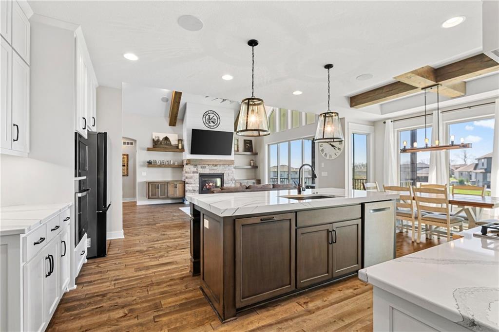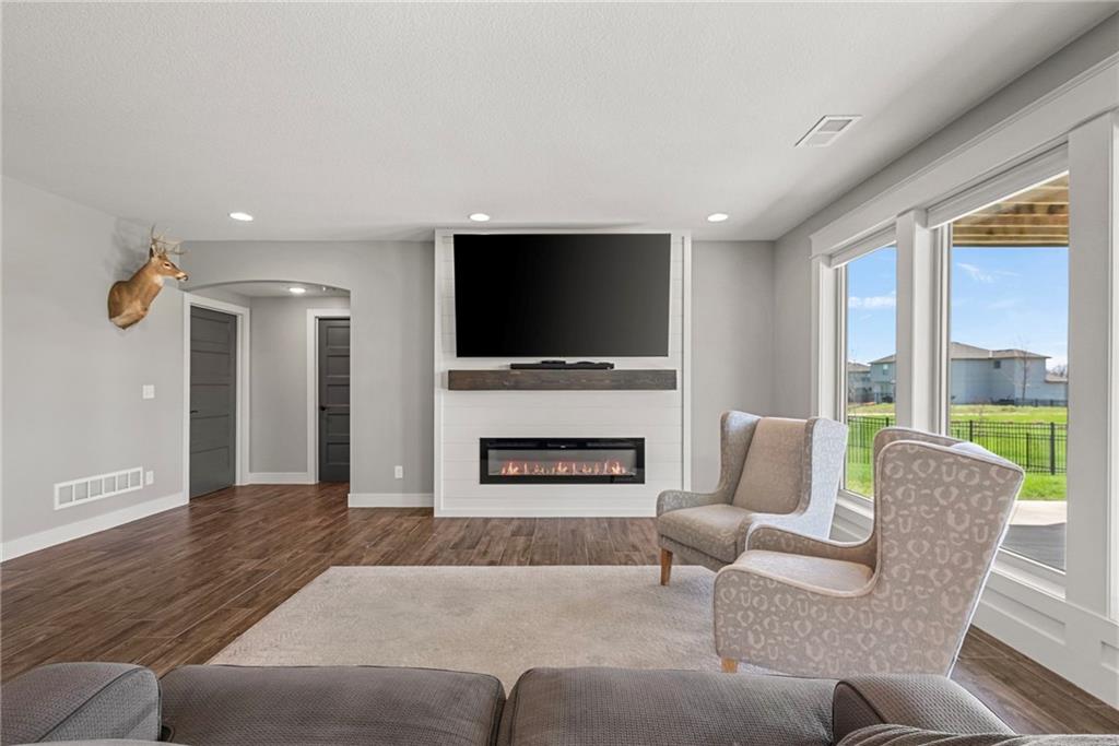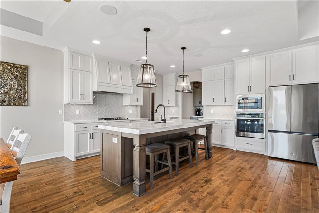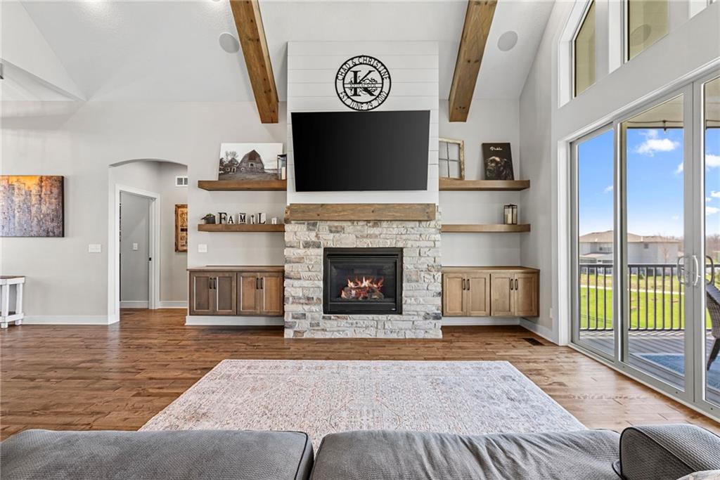 Welcome to 1013 Old Hickory Road, a truly custom-built 4-bedroom, 4-bathroom home located in one of Greenwood’s most sought-after neighborhoods. Unlike a typical spec home, this thoughtfully designed property showcases quality craftsmanship, premium finishes, and a layout built for real-life living and entertaining. From the moment you walk in, you’ll be impressed by the bright, open floor plan, soaring vaulted ceilings, and attention to detail throughout. The spacious kitchen is a showstopper, featuring sleek quartz countertops, custom cabinetry, and stainless steel appliances—all flowing seamlessly into a cozy living room anchored by a fireplace. The main level features generously sized bedrooms, including a stunning primary suite with a walk-in closet and a luxurious ensuite bath. The lower level is a fully finished walkout basement, offering flexible space for a second living area, home theater, game room, with 2 additional spacious bedrooms—plus easy access to the backyard for seamless indoor-outdoor living. Step outside to enjoy a beautifully landscaped yard, a large deck for entertaining, and the privacy you’ve been searching for. With 4 full bathrooms, there's no shortage of space and comfort for family and guests alike. Located in the award-winning Lee’s Summit School District and just minutes from parks, dining, and shopping, this one-of-a-kind home blends custom style with everyday functionality. Don't miss your chance to own this exceptional property—schedule your private showing of 1013 Old Hickory Road today! JFE Construction (Gunnison IV Reverse Plan). Enjoy a built-in Sonos speaker system throughout the interior and exterior, perfect for effortless whole-home audio and outdoor entertaining. The back patio is pre-wired for a hot tub, making it ready for your personal spa setup whenever you're ready to unwind.