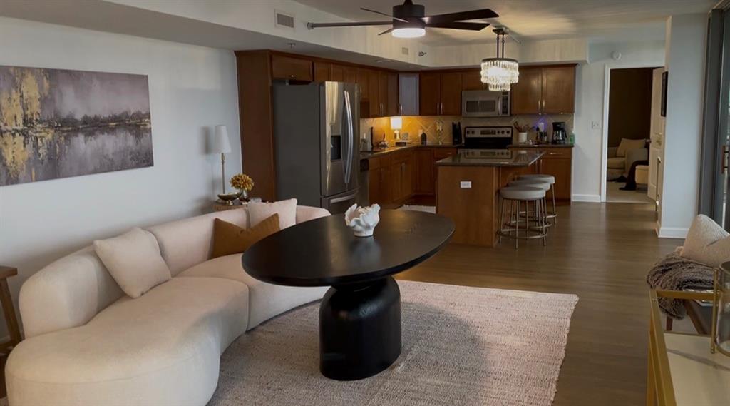 Nestled in the vibrant heart of downtown Kansas City, this exquisitely updated two-bedroom, two-bathroom residence epitomizes stylish urban living. Thoughtfully renovated to showcase high-end finishes, this home features newly refinished hardwood floors throughout its spacious living areas, complemented by sumptuous plush carpeting selected specifically for the bedrooms. Step outside onto your stylish condo balcony, where afternoon sunlight bathes the space and offers breathtaking sunset views—a mesmerizing transition as the city transitions into the captivating night rhythms of Kansas City's luminous skyline. Highlights of this sophisticated residence include sleek granite countertops and premium stainless steel appliances, perfectly integrated into a sizable kitchen and island. This space is an entertainer's dream, ideal for hosting friends or enjoying serene mornings while sipping coffee and watching the city come alive. Beyond mere luxury, this condo enhances your lifestyle. Envision delightful gatherings with stunning views, cozy movie nights in the private theater, or leisurely afternoons on the open-air patio. Enjoy the full array of amenities, including a state-of-the-art gym, rejuvenating sauna, tennis and basketball courts, a game lounge, and a golf putting room—each designed to provide a retreat-like experience right at home. Practicality meets sophistication with two dedicated garage spaces, in-unit laundry, expansive walk-in closets, and an additional basement storage unit to accommodate your every need. A reverse osmosis drinking water system further exemplifies thoughtful living in this remarkable space. Situated mere moments from the dynamic Power & Light District, River Market, and convenient highway access, this residence is more than just a home; it is a declaration of your appreciation for design, location, and the desire to embark on an exhilarating new chapter in life. Embrace the urban lifestyle you've always envisioned!