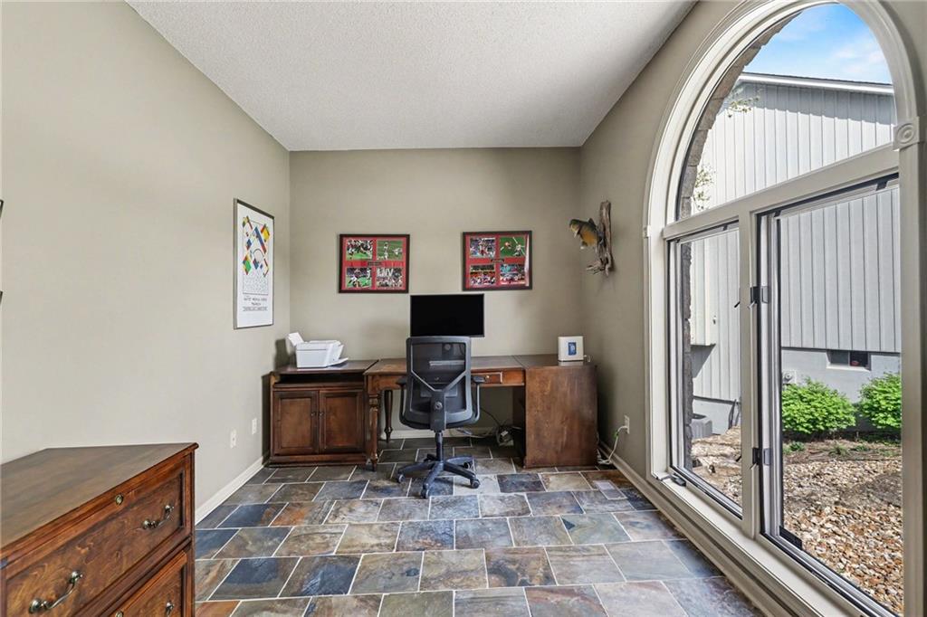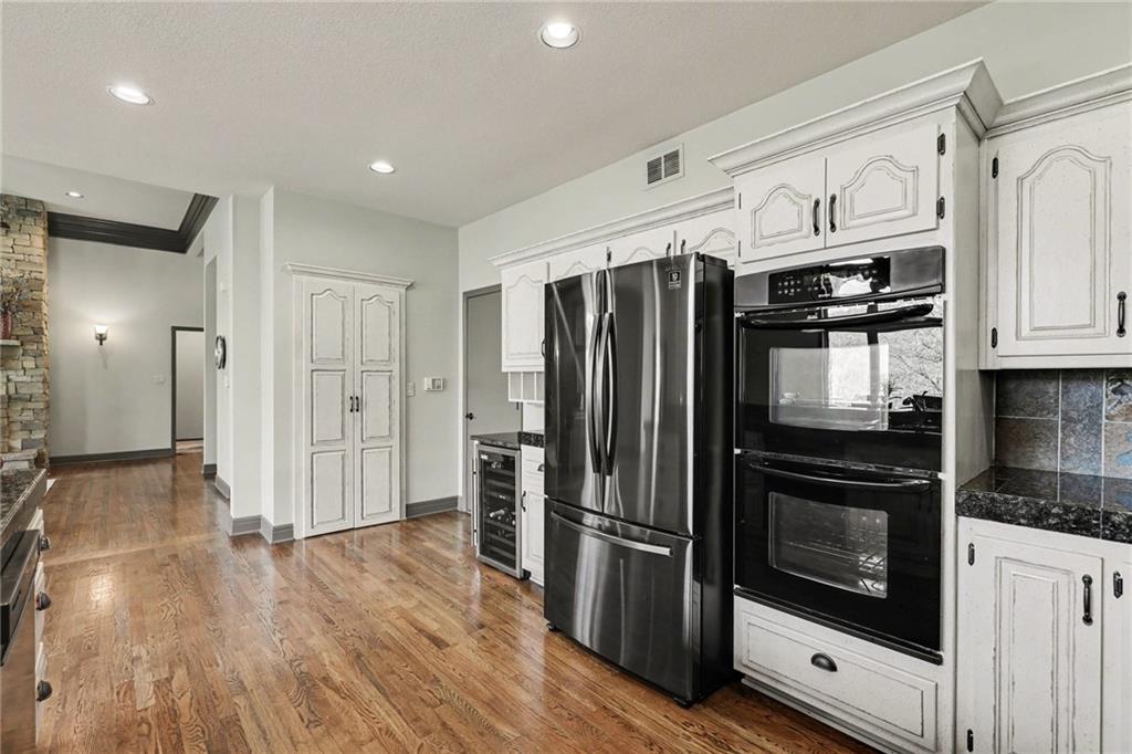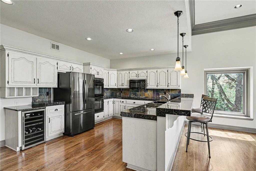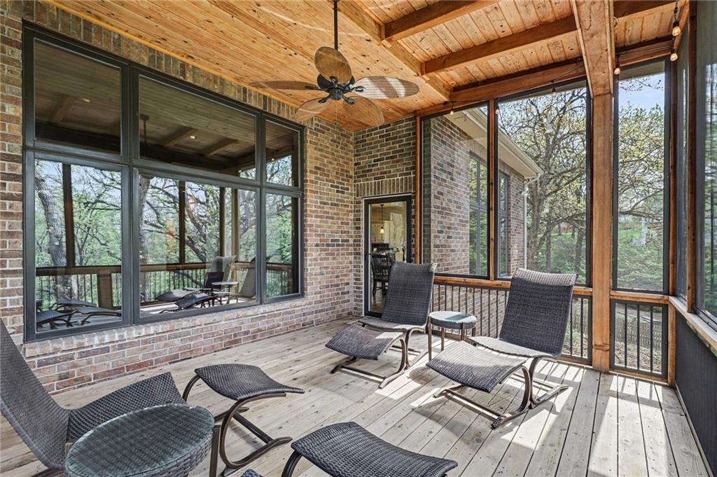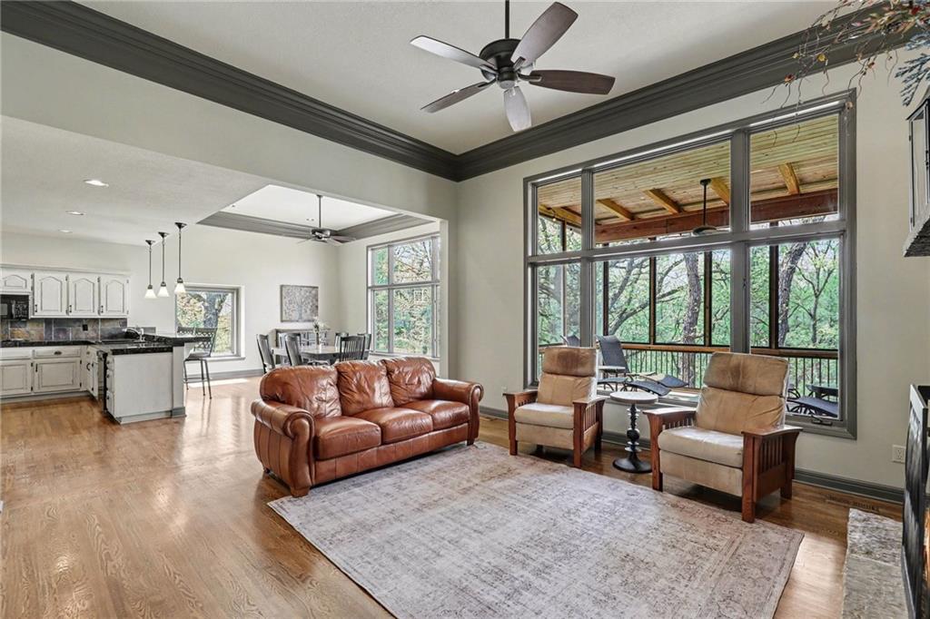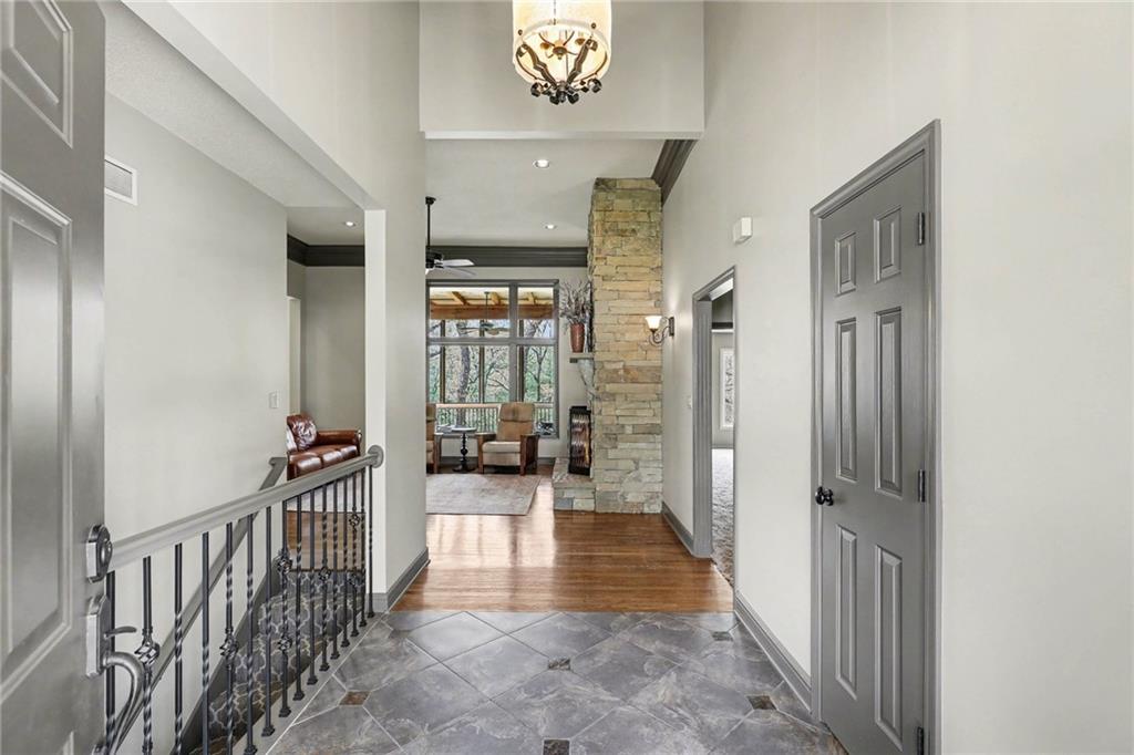 Stunning custom-built home where thoughtful design meets breathtaking views—come for the house, stay for the scenery. The chef’s kitchen is a showstopper with hardwood floors, custom cabinetry, granite tile countertops, a breakfast bar with seating, and stylish pendant lighting. The breakfast area features soaring ceilings, walls of windows, and access to the covered, screened-in porch—perfect for relaxing mornings or evenings. The inviting Great Room offers beautiful views of the treed backyard, upgraded trim, and a striking stone fireplace. The grand entry welcomes you with a vaulted ceiling, updated lighting, and tiled flooring. The primary suite is a retreat with bayed windows, a tray ceiling, and ceiling fan. The spa-like bath includes a double vanity with custom cabinetry, tiled floors, and a walk-in tiled shower. A secondary bedroom on the main level offers flexibility as a guest room or office. The large laundry room adds convenience with cabinetry and a sink. The lower level features a spacious living area with a corner fireplace and access to another covered deck, along with two generously sized bedrooms, a full bath, and a non-conforming bonus room. The next level is perfect for entertaining with a massive rec room, wet bar, and additional full bath. Walk out to the private, landscaped backyard and enjoy the serene, wooded setting year-round. Additional highlights include storage space under the two-car garage and a dedicated workshop area. This home truly has it all—space, function, and incredible views.