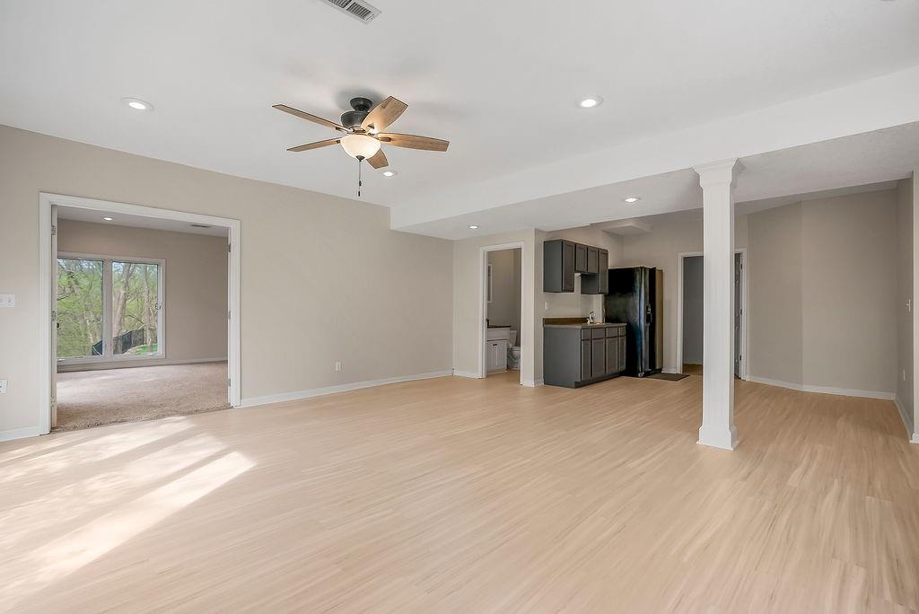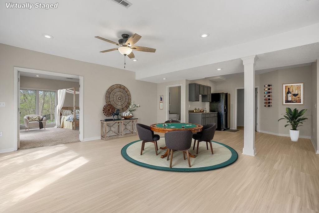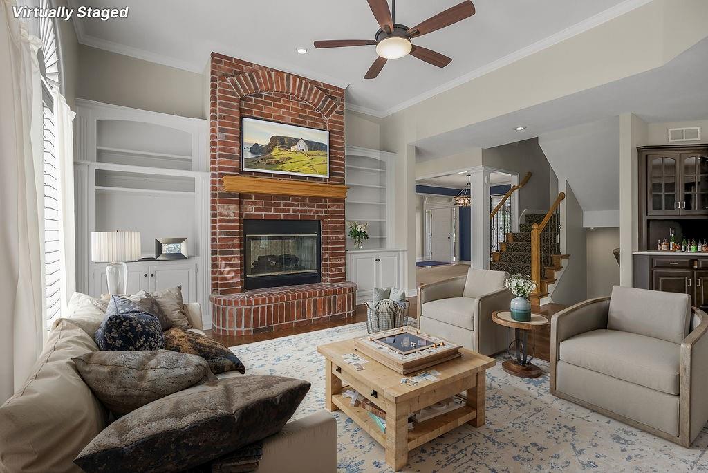 This meticulously maintained 1.5-story home with a finished walk-out basement is perfectly situated at the end of a quiet cul-de-sac. Set on a spectacular wooded lot backing to a scenic valley and greenbelt, the property offers exceptional privacy and serene views, with frequent visits from local wildlife. Main level features an open formal dining room perfect for entertaining large groups, a living room with a wall of windows, hearth room with built-ins and a see-through brick fireplace to the living room, and an updated kitchen (2024) with white quartz and three pantries (one walk-in). The main-floor primary suite offers a bay window, boxed vaulted ceiling with interior lighting, a spa-like bath with separate tub and shower, see-through fireplace to the bedroom, and a huge walk-in closet. Laundry with desk/folding counter off the 3-car garage. Screened deck overlooks private, tree-filled backyard. Upstairs: three bedrooms — two share a Jack-and-Jill bath, one with a private ensuite — plus built-in bookcases in the hall and guest bedroom and easy attic access that could be finished as a loft. Finished walk-out basement includes large game area with wet bar, 5th bedroom, 4th full bath, separate TV room, and patio. Additional highlights: immaculate condition, hardwoods on main level, plantation shutters, central vac, sprinkler system, wired for surround sound on main floor, natural stone landscaping and retaining walls, stamped concrete walkways, exterior paint 2022, dual HVAC units. Enjoy resort-style living in Cedar Creek — one of Kansas City’s finest neighborhoods with access to a 65-acre fishing lake, 3 community pools, lighted tennis & pickleball courts, clubhouse, indoor gym, and miles of walking trails.