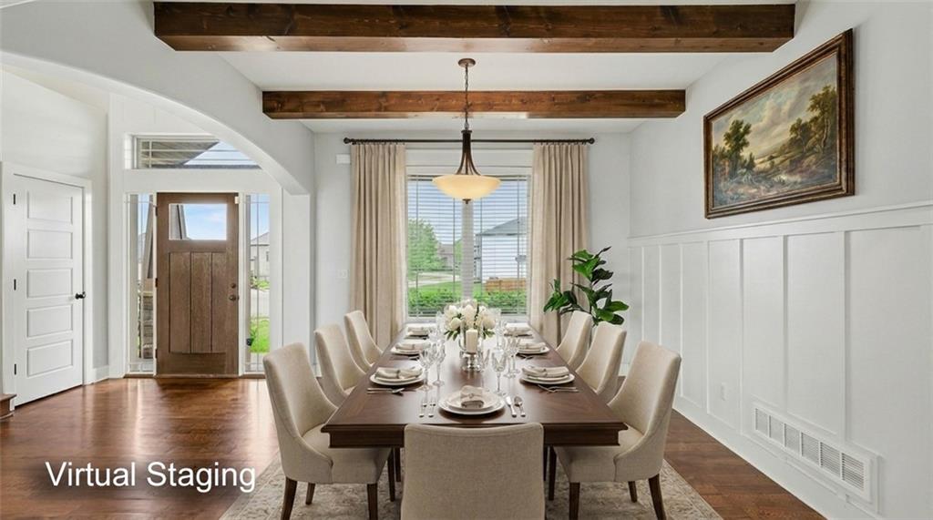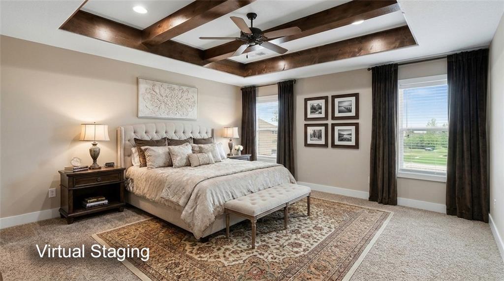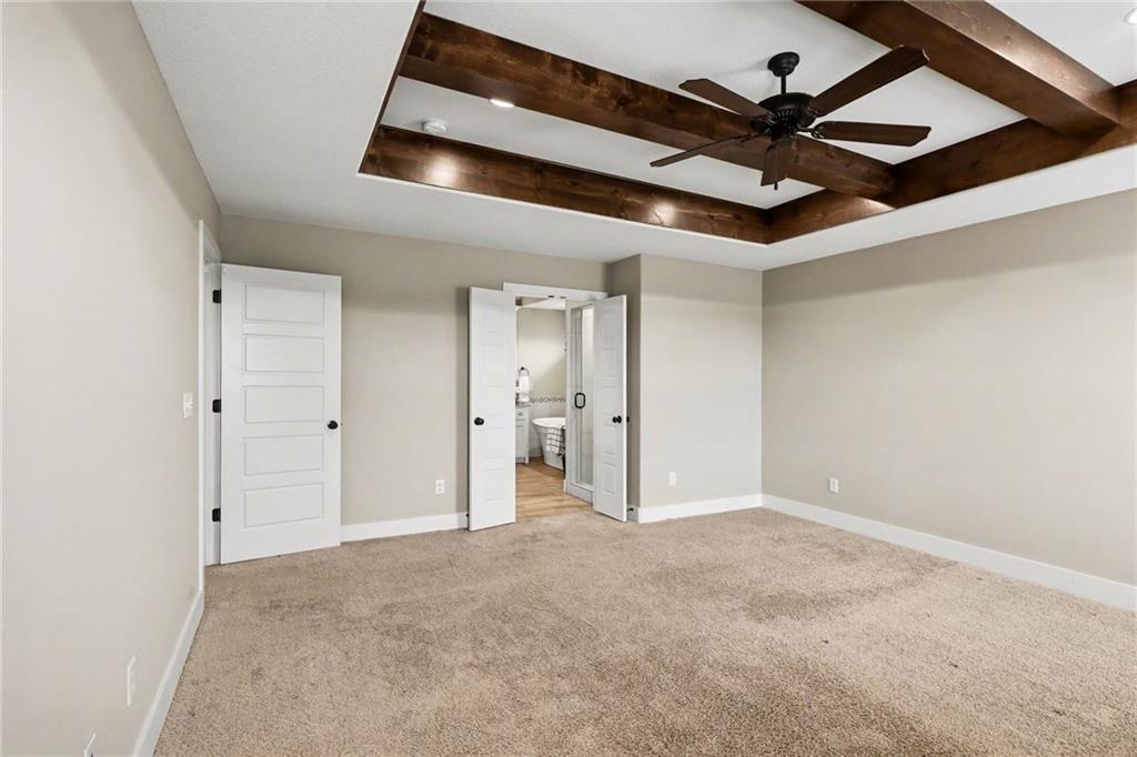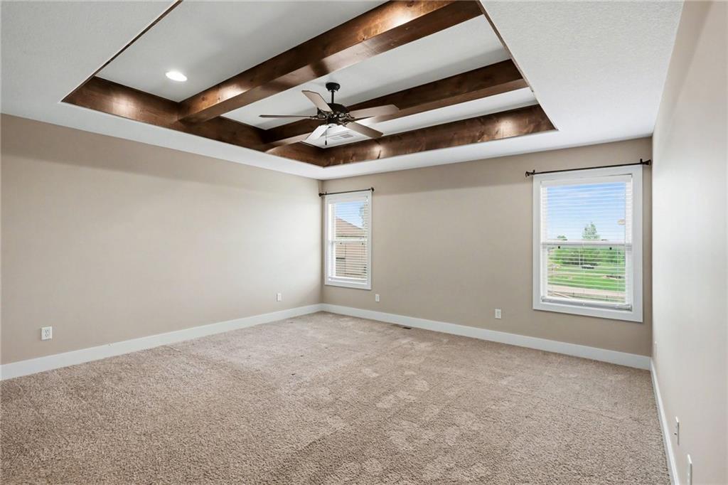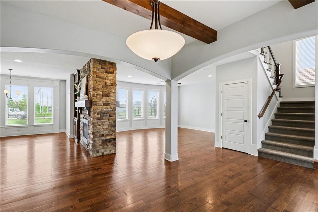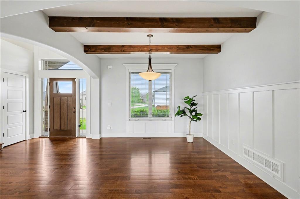 Welcome to this beautifully designed home in the highly sought-after Foxberry Estates, where thoughtful upgrades and spacious living come together in one exceptional property. Beautiful great room featuring expansive windows, hardwood floors, and a cozy fireplace. The gourmet kitchen is designed for both function and style with a center island, tiled backsplash, granite countertops, and a spacious walk-in pantry. Formal dining room showcases picture box molding and stunning walnut-stained ceiling beams. Upstairs, the primary suite offers a true retreat with eye-catching wood beams, a large walk-in closet, and a spa-like bath complete with dual vanities, a free-standing soaking tub, and a walk-in shower with dual showerheads. Bedrooms 2–4 are generously sized with convenient immediate access to bathrooms. The finished lower level provides additional living space with a rec room featuring luxury vinyl plank flooring, a 5th bedroom, and a 4th full bath—perfect for guests or multi-generational living. Enjoy the outdoors in the fenced backyard with an extended patio and firepit, plus the convenience of an in-ground sprinkler system. Located in highly desirable Foxberry Estates, residents enjoy resort-style amenities including a zero-entry pool, clubhouse for events, scenic walking trails, three stocked ponds, basketball hoop, and playgrounds.
