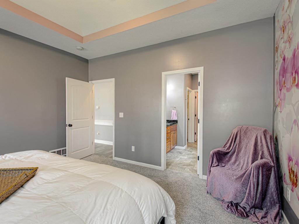 Beautiful true ranch home with an open, inviting layout. The spacious great room features a fireplace, ceiling fan, and abundant natural light. Ceramic tile flooring extends from the entry through the hallways, great room, kitchen, and both bathrooms. The kitchen offers granite countertops, a center island with breakfast bar, stainless steel appliances, and ceramic tile floors. Convenient main-floor laundry. The bedroom layout provides added privacy, with two secondary bedrooms on one side of the home and the primary suite on the other. The primary bedroom features a double-vault ceiling, ceiling fan, and a large walk-in closet. The primary bath includes a double vanity, jetted tub, and separate shower. Enjoy outdoor living with both a front patio and a large backyard patio. The backyard is fully enclosed with a wood privacy fence and includes a storage shed for extra space. Nicely landscaped yard in the front, back, and sides. Two-car attached garage with a three-car driveway.