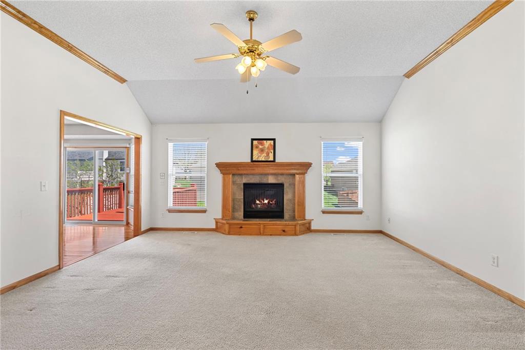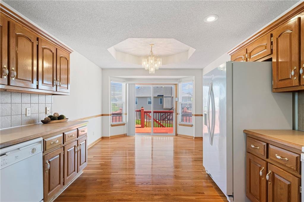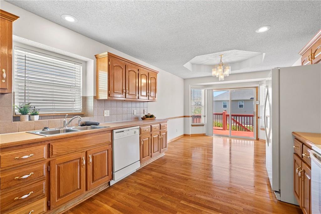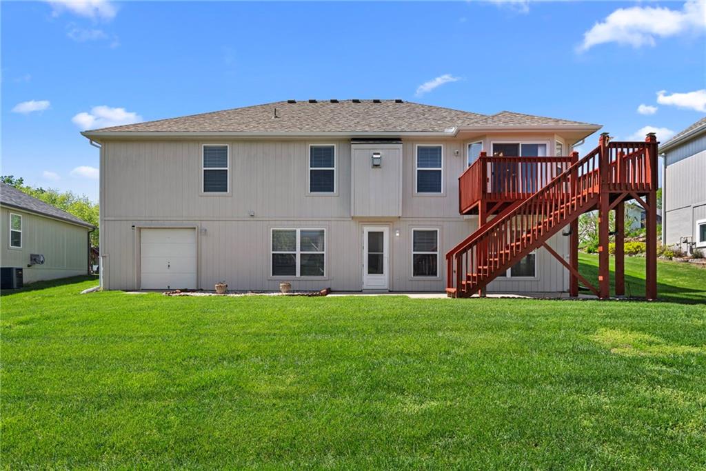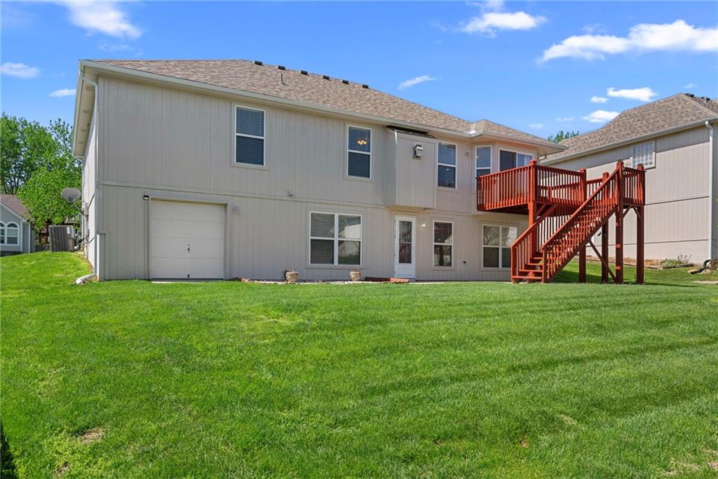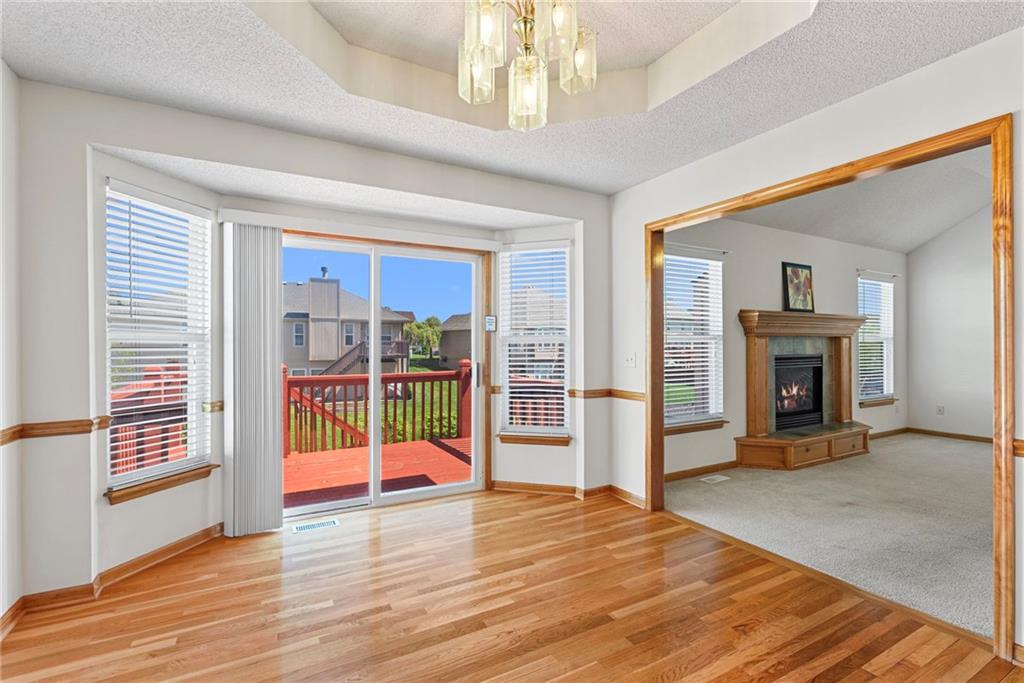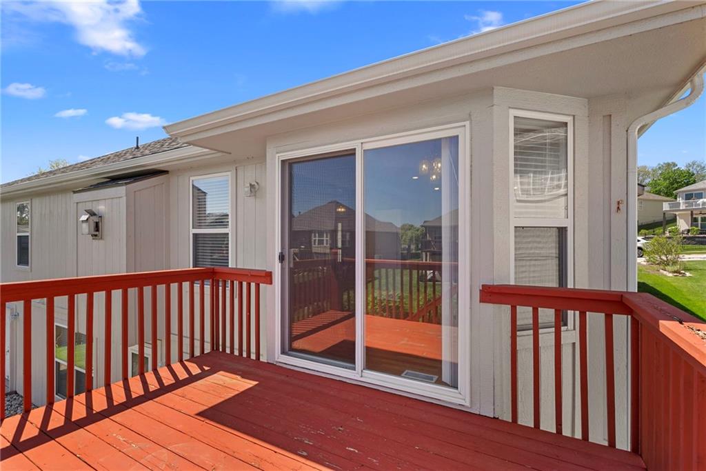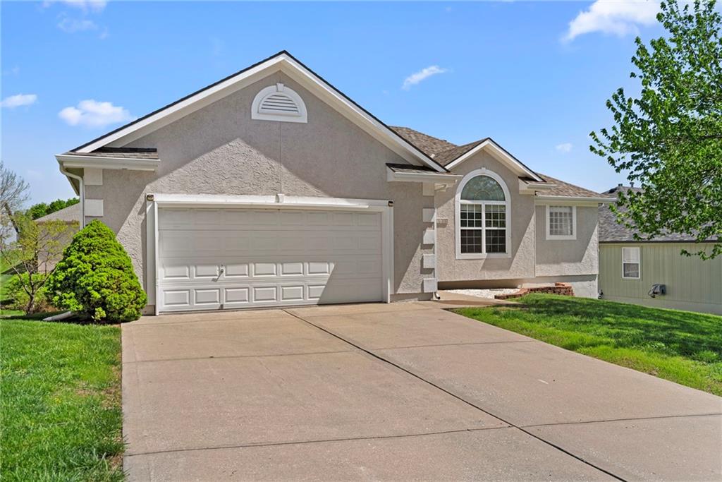 Rare opportunity in the desirable Eastridge Meadows community! This well-maintained ranch/reverse 1.5 story home on a walkout lot offers 3 generously sized bedrooms, 3 baths, and nearly 2,200 finished square feet. The thoughtfully designed layout provides comfortable main-level living with spacious rooms, wide hallways, and excellent storage. The great room features 10-foot ceilings with crown moulding, a cozy gas fireplace, and an open feel ideal for everyday living and entertaining. The eat-in kitchen offers hardwood floors, abundant cabinetry, and all appliances stay — just bring your dishes! The bright dining area features tray ceilings and easy access to the deck for seamless indoor-outdoor flow. The primary suite impresses with a vaulted ceiling and semi-circle window, while the spacious primary bath features a jetted tub and large walk-in closet. The second main-level bedroom also offers a walk-in closet and flexible use as a guest room or home office. Main-level laundry is conveniently located just steps from both main-level bedrooms. The finished walkout lower level adds a large third bedroom and adjacent bath, along with a spacious rec room — ideal for guests, extended family, or multi-generational living. Additional highlights in the lower level include a cedar closet and ample storage with built-in shelving. Walk out to the patio, offering another great outdoor space along with the deck above. One unique lower-level feature is the utility garage/workshop space with its own garage door entrance, perfect for hobbies, projects, lawn equipment, or extra storage. Major improvements include a NEWER roof and gutters (2024) and HVAC replaced in 2015. Carpets have been freshly cleaned, and this one-owner home has been very well cared for, offering an excellent opportunity to personalize while enjoying a solid home in a convenient Blue Springs location. This is one you definitely won't want to miss!