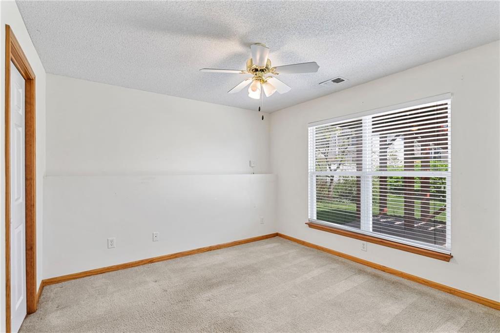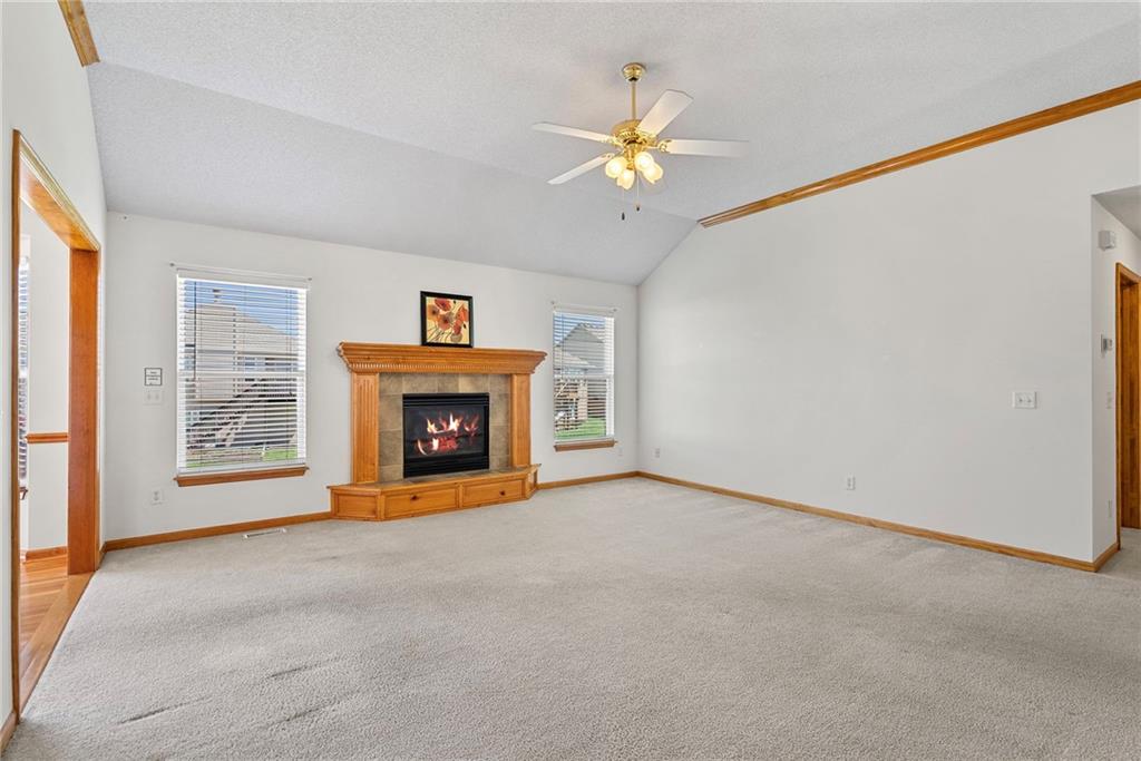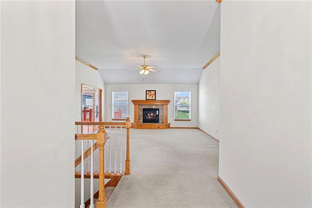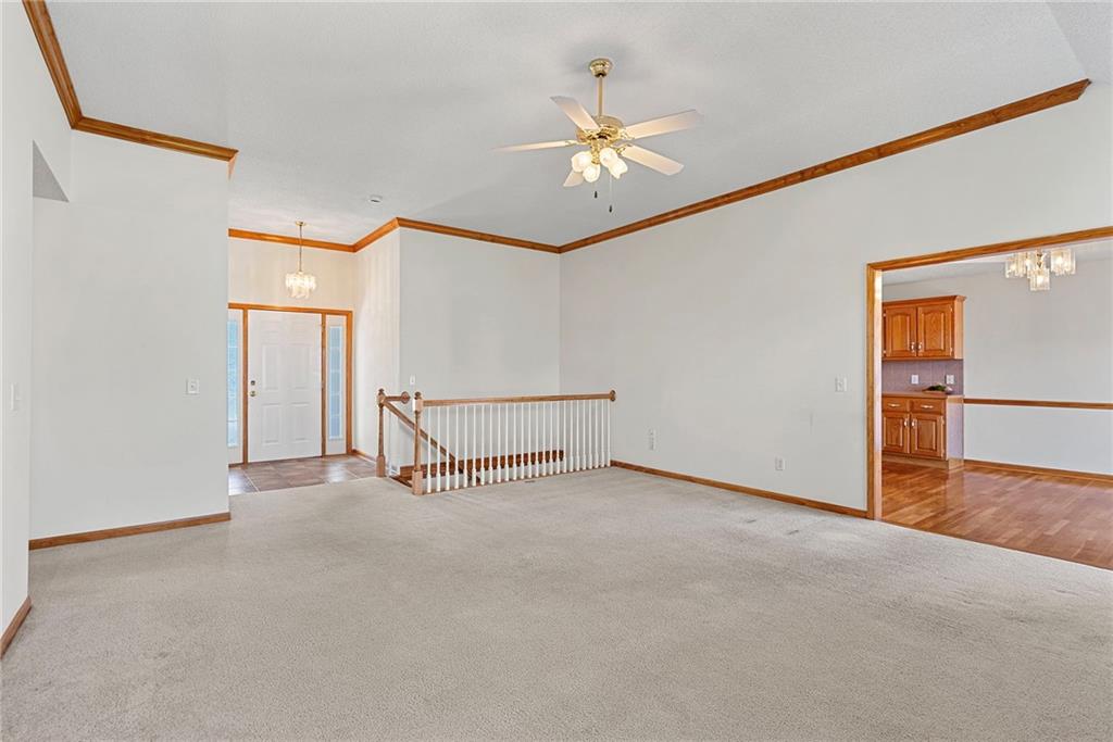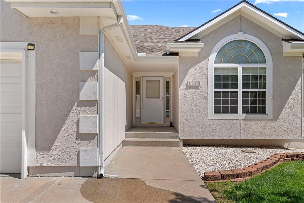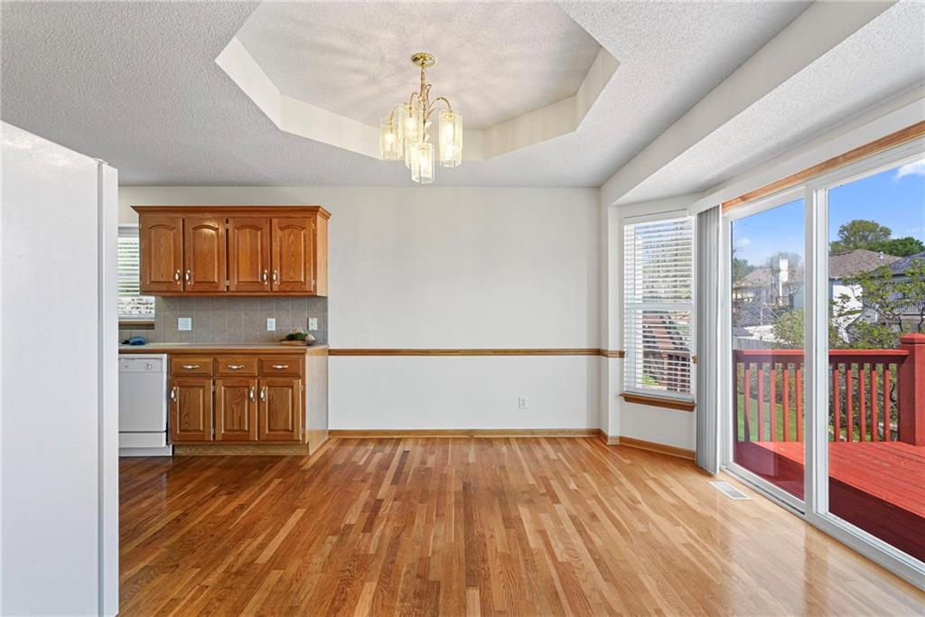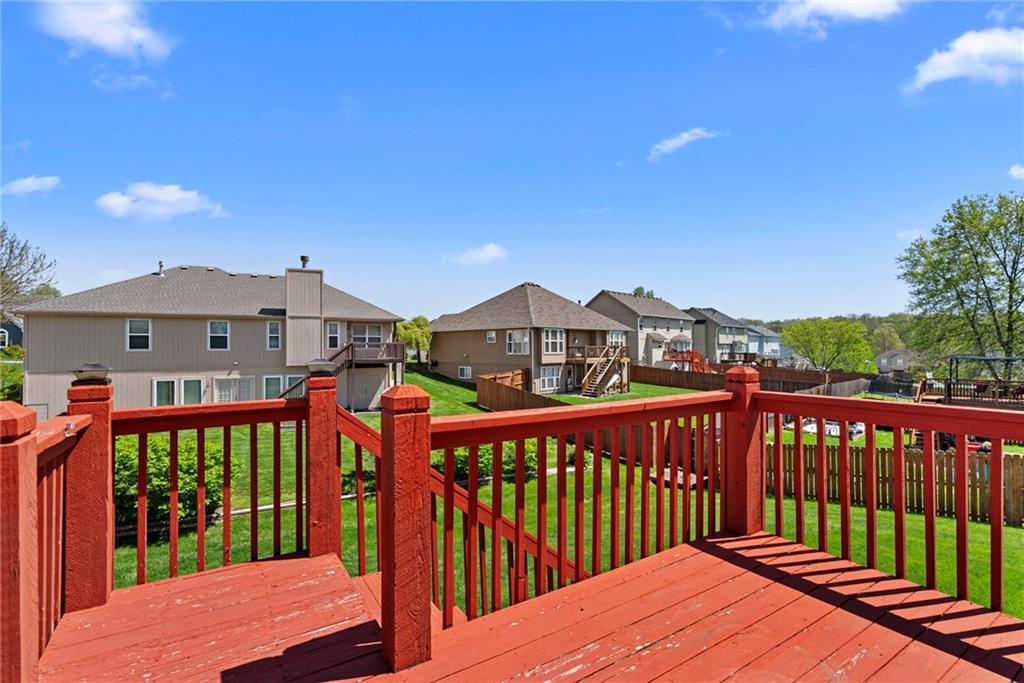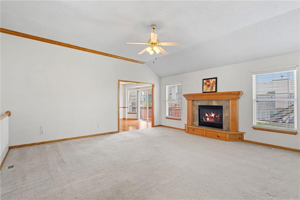 Rare opportunity in the desirable Eastridge Meadows community! This well-maintained ranch/reverse 1.5 story home on a walkout lot offers 3 generously sized bedrooms, 3 baths, and nearly 2,200 finished square feet. The thoughtfully designed layout provides comfortable main-level living with spacious rooms, wide hallways, and excellent storage. The great room features 10-foot ceilings with crown moulding, a cozy gas fireplace, and an open feel ideal for everyday living and entertaining. The eat-in kitchen offers hardwood floors, abundant cabinetry, and all appliances stay — just bring your dishes! The bright dining area features tray ceilings and easy access to the deck for seamless indoor-outdoor flow. The primary suite impresses with a vaulted ceiling and semi-circle window, while the spacious primary bath features a jetted tub and large walk-in closet. The second main-level bedroom also offers a walk-in closet and flexible use as a guest room or home office. Main-level laundry is conveniently located just steps from both main-level bedrooms. The finished walkout lower level adds a large third bedroom and adjacent bath, along with a spacious rec room — ideal for guests, extended family, or multi-generational living. Additional highlights in the lower level include a cedar closet and ample storage with built-in shelving. Walk out to the patio, offering another great outdoor space along with the deck above. One unique lower-level feature is the utility garage/workshop space with its own garage door entrance, perfect for hobbies, projects, lawn equipment, or extra storage. Major improvements include a NEWER roof and gutters (2024) and HVAC replaced in 2015. Carpets have been freshly cleaned, and this one-owner home has been very well cared for, offering an excellent opportunity to personalize while enjoying a solid home in a convenient Blue Springs location. This is one you definitely won't want to miss!