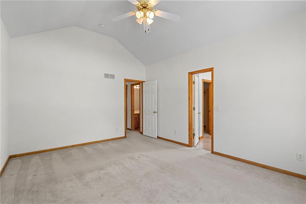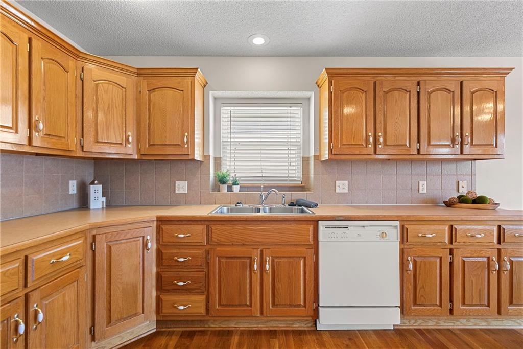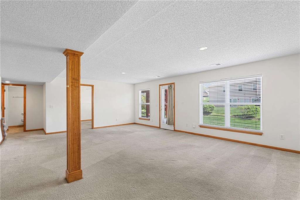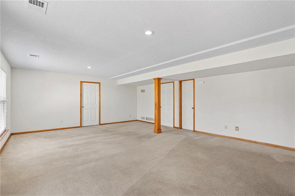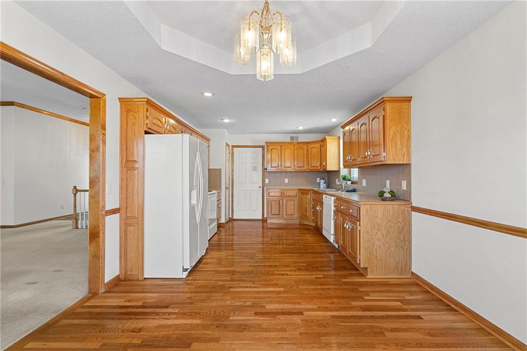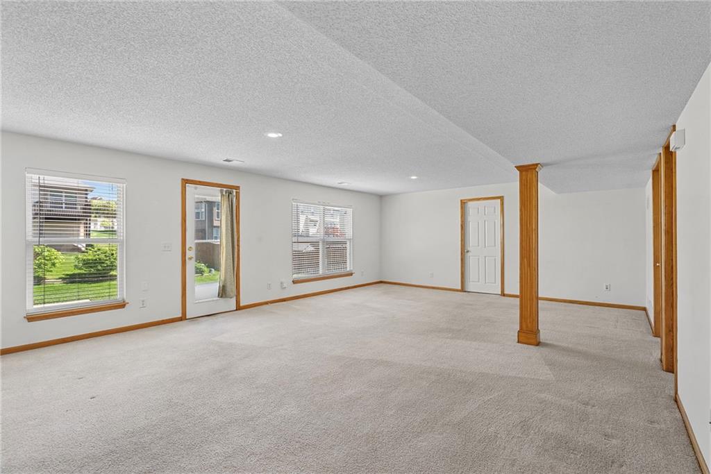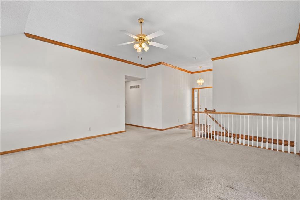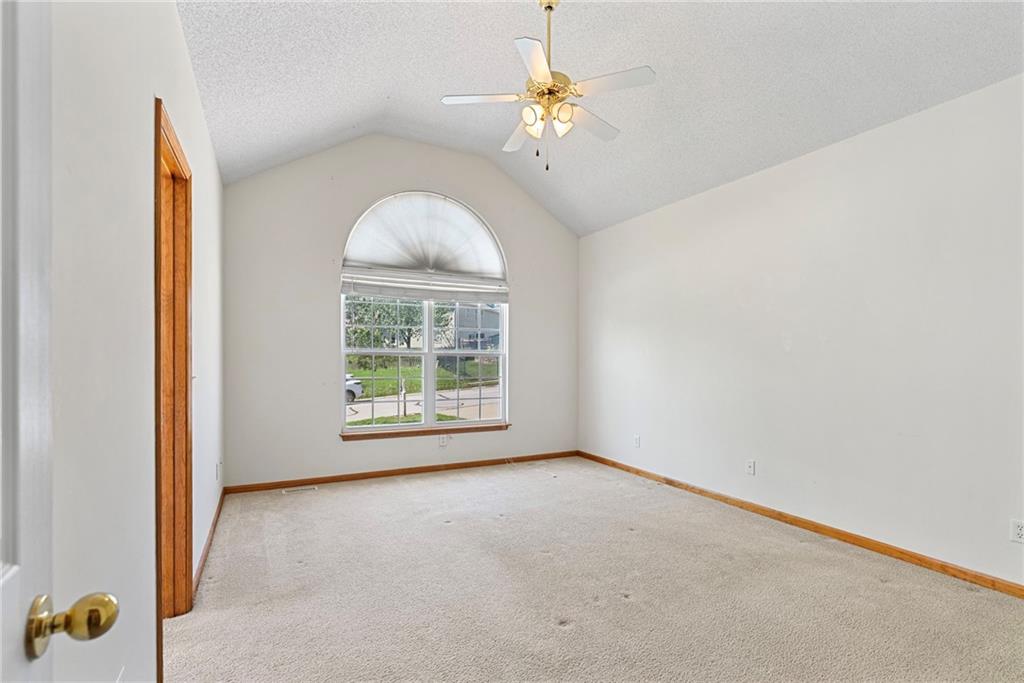 Rare opportunity in the desirable Eastridge Meadows community! This well-maintained ranch/reverse 1.5 story home on a walkout lot offers 3 generously sized bedrooms, 3 baths, and nearly 2,200 finished square feet. The thoughtfully designed layout provides comfortable main-level living with spacious rooms, wide hallways, and excellent storage. The great room features 10-foot ceilings with crown moulding, a cozy gas fireplace, and an open feel ideal for everyday living and entertaining. The eat-in kitchen offers hardwood floors, abundant cabinetry, and all appliances stay — just bring your dishes! The bright dining area features tray ceilings and easy access to the deck for seamless indoor-outdoor flow. The primary suite impresses with a vaulted ceiling and semi-circle window, while the spacious primary bath features a jetted tub and large walk-in closet. The second main-level bedroom also offers a walk-in closet and flexible use as a guest room or home office. Main-level laundry is conveniently located just steps from both main-level bedrooms. The finished walkout lower level adds a large third bedroom and adjacent bath, along with a spacious rec room — ideal for guests, extended family, or multi-generational living. Additional highlights in the lower level include a cedar closet and ample storage with built-in shelving. Walk out to the patio, offering another great outdoor space along with the deck above. One unique lower-level feature is the utility garage/workshop space with its own garage door entrance, perfect for hobbies, projects, lawn equipment, or extra storage. Major improvements include a NEWER roof and gutters (2024) and HVAC replaced in 2015. Carpets have been freshly cleaned, and this one-owner home has been very well cared for, offering an excellent opportunity to personalize while enjoying a solid home in a convenient Blue Springs location. This is one you definitely won't want to miss!