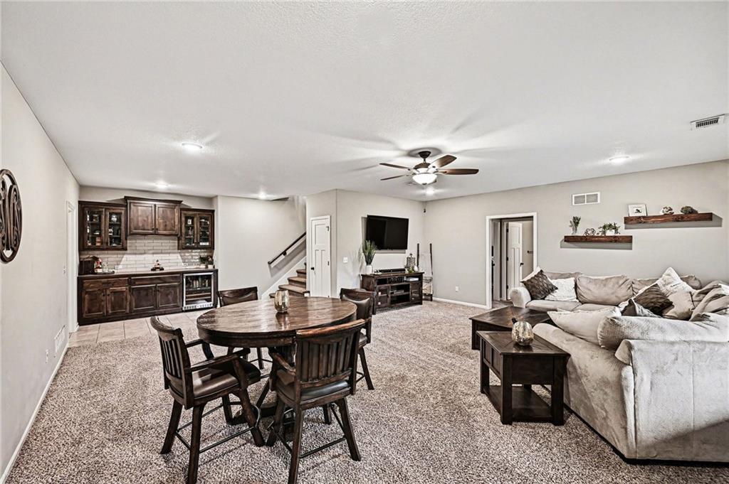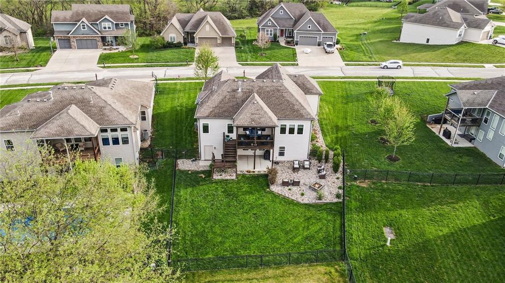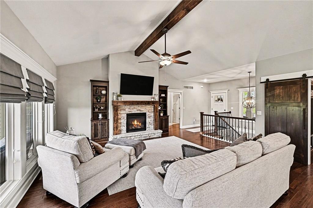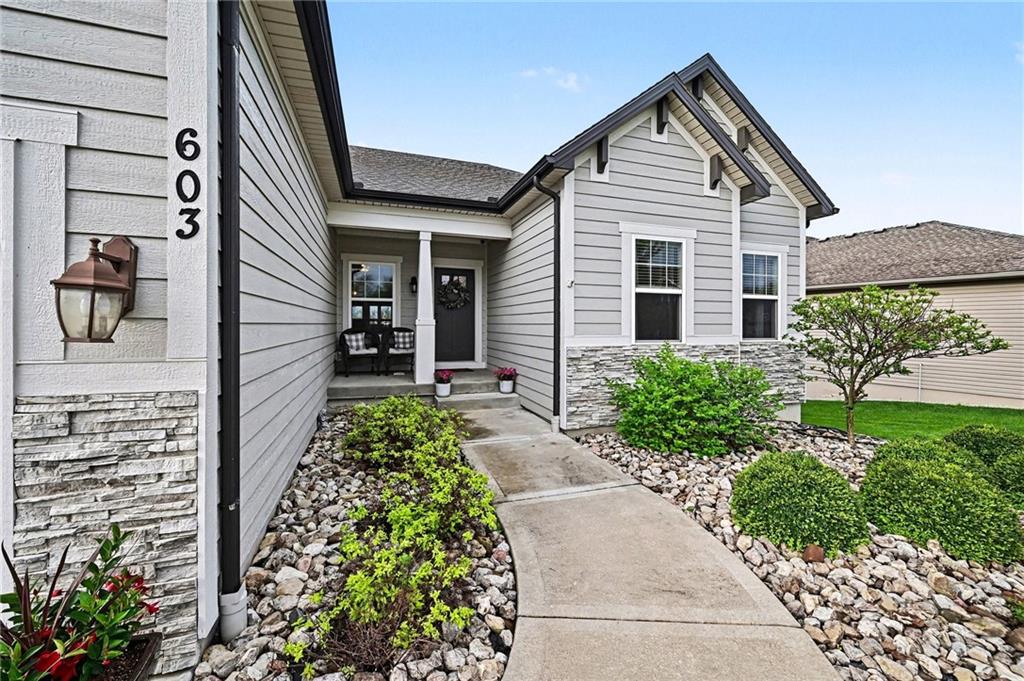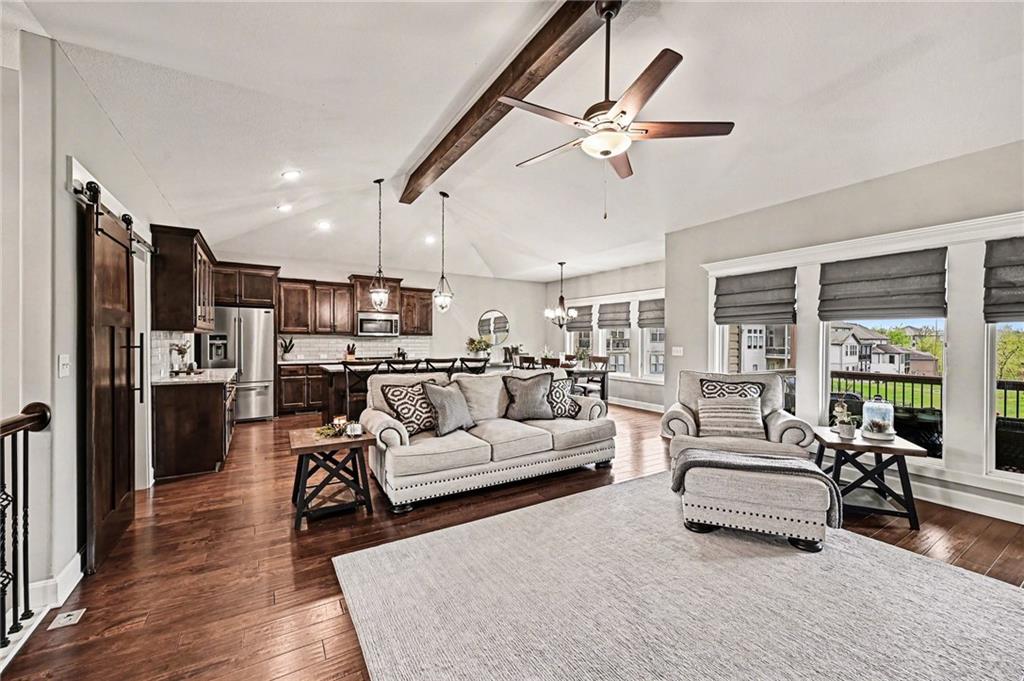This cute home features meticulously maintained landscaping and great curb appeal. Upon entry, you are welcomed by vaulted ceilings, large windows, and an open, airy layout. Classic wood flooring complements the fireplace, barn doors, and a beautiful wooden beam across the ceiling, tying the space together. The kitchen continues the warm wood look and is complemented by stainless steel appliances and a spacious walk in pantry. Nearby, a hallway offers a convenient drop zone, along with access to the laundry room and the three car garage. The primary suite offers a relaxing retreat with a generously sized layout and a large bathroom complete with tile flooring, a walk-in shower, double sinks, and a nice sized walk-in closet. The well-appointed secondary bedroom offers two large windows to add amazing light, perfect for an office or a guest room. The full bath creates an ideal space for guests or flexible main-level living. Downstairs, the finished lower level offers a large rec room with a built in bar area that is already stubbed for water, making it easy to convert into a full wet bar, complete with a mini fridge, making it ideal for entertaining. This space also includes large windows and access to the backyard. Two additional bedrooms and a full bathroom are located on this level, along with a fun under the stairs hideout currently used as a kids space. A very large utility room provides plenty of storage. The property is also pre-wired for a whole-home generator, offering added convenience for future installation. Step outside to a well-maintained outdoor space that offers the perfect setting, complete with a stone fire pit for relaxing or entertaining, and a built-in sprinkler/irrigation system to keep the lawn and landscaping looking their best year-round. Located in a prime area within the Smithville School District, this home is just minutes from Smithville Lake, golf courses, walking trails, and more.