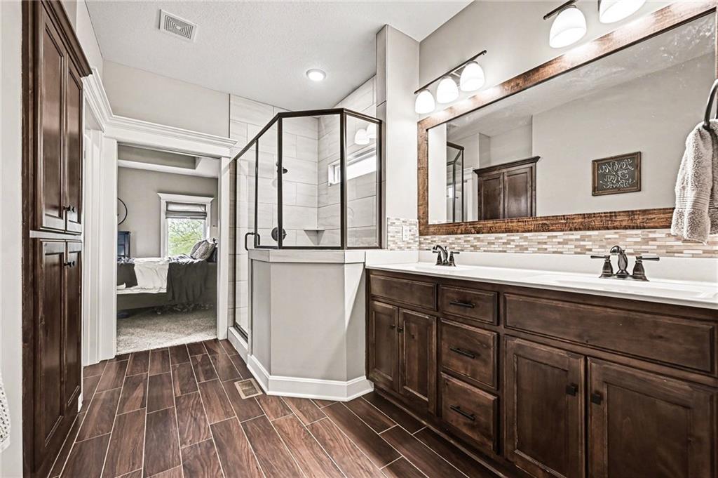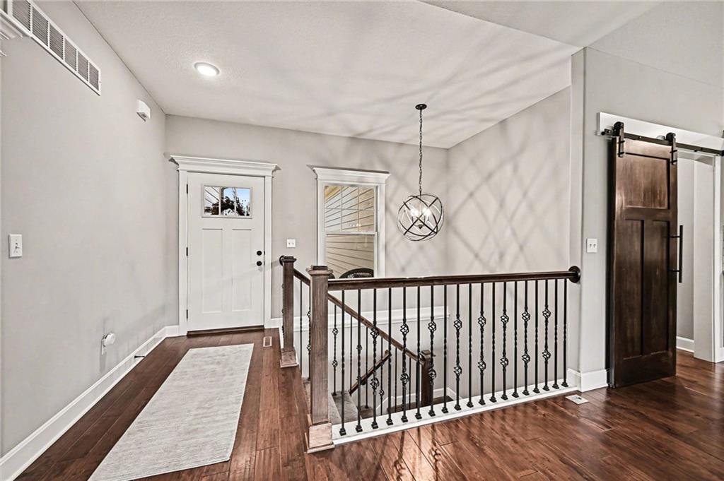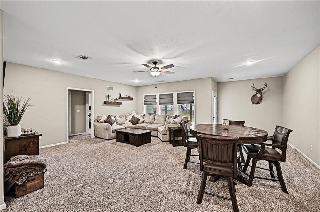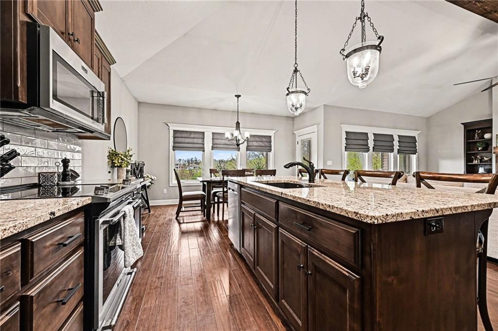 This cute home features meticulously maintained landscaping and great curb appeal. Upon entry, you are welcomed by vaulted ceilings, large windows, and an open, airy layout. Classic wood flooring complements the fireplace, barn doors, and a beautiful wooden beam across the ceiling, tying the space together. The kitchen continues the warm wood look and is complemented by stainless steel appliances and a spacious walk in pantry. Nearby, a hallway offers a convenient drop zone, along with access to the laundry room and the three car garage. The primary suite offers a relaxing retreat with a generously sized layout and a large bathroom complete with tile flooring, a walk-in shower, double sinks, and a nice sized walk-in closet. The well-appointed secondary bedroom offers two large windows to add amazing light, perfect for an office or a guest room. The full bath creates an ideal space for guests or flexible main-level living. Downstairs, the finished lower level offers a large rec room with a built in bar area that is already stubbed for water, making it easy to convert into a full wet bar, complete with a mini fridge, making it ideal for entertaining. This space also includes large windows and access to the backyard. Two additional bedrooms and a full bathroom are located on this level, along with a fun under the stairs hideout currently used as a kids space. A very large utility room provides plenty of storage. The property is also pre-wired for a whole-home generator, offering added convenience for future installation. Step outside to a well-maintained outdoor space that offers the perfect setting, complete with a stone fire pit for relaxing or entertaining, and a built-in sprinkler/irrigation system to keep the lawn and landscaping looking their best year-round. Located in a prime area within the Smithville School District, this home is just minutes from Smithville Lake, golf courses, walking trails, and more.