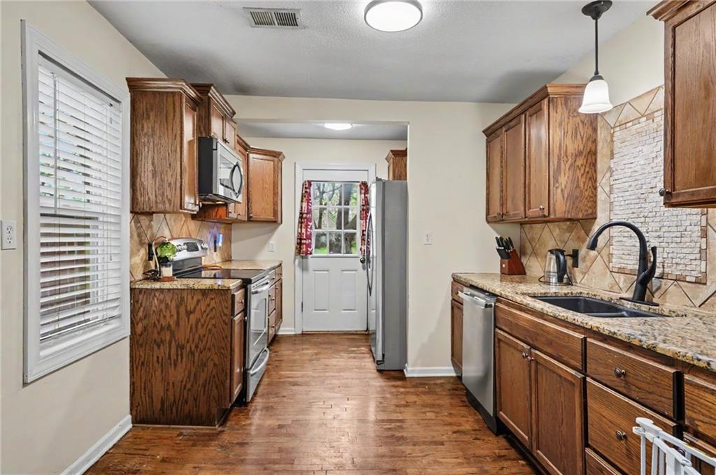 Welcome home to this charming 3 bedroom,1 bath property nestled in adorable Spring Hill. This home features convenient one-level living, plus detached garage/shop, and a huge yard!! Step inside to find beautiful hardwood flooring throughout, updated kitchen with granite countertops and detailed tile backsplash, along with stainless steel appliances, and brand-new AC, Furnace, and Hot Water Heater. The living room, with large picture windows providing ample natural light, opens to the eat-in kitchen with access to the spacious back yard and shop. The 3 bedrooms are conveniently located by the laundry room and bathroom complete with a tub/shower combo. The garage/shop has concrete flooring, new electric panel in 2024, and plenty of space for vehicles, storage, or hobbies. The generously sized, fenced, backyard has beautiful mature trees and is perfect for entertaining, gardening, and outdoor play. Centrally located within a short distance to Spring Hill schools and Aquatic Center, don't miss the opportunity to call this home.