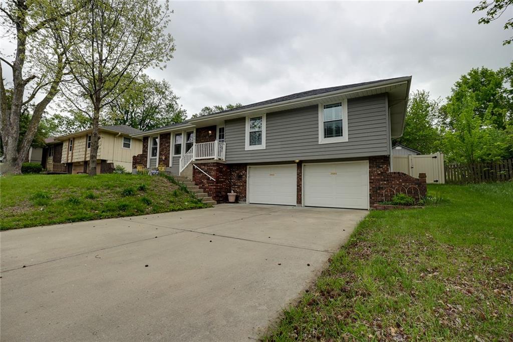 Split-level residence featuring brick and horizontal siding, a two-car garage, and a concrete driveway