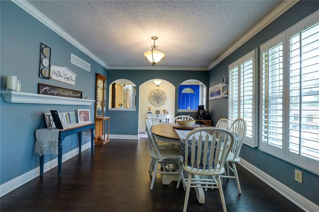 Dining space featuring rich wood-finish flooring, white crown molding, and plantation shutters