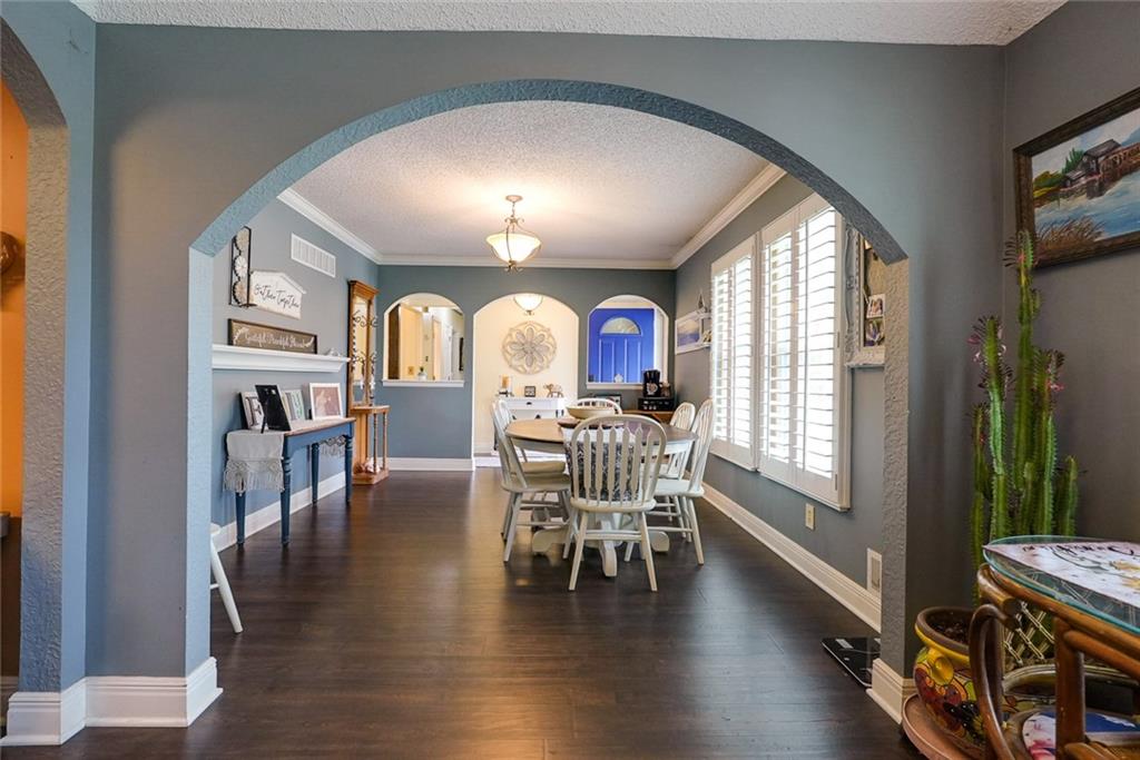 Interior space featuring a prominent arched doorway, dark wood-finish flooring, and white plantation shutters