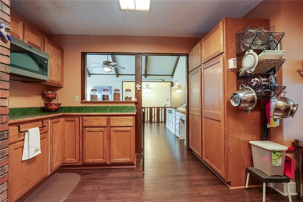 Kitchen with wood-finish flooring, natural wood cabinetry, green countertops, and a built-in microwave