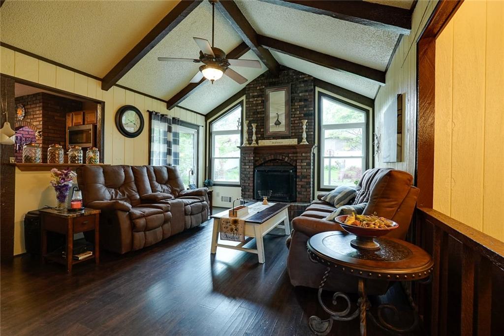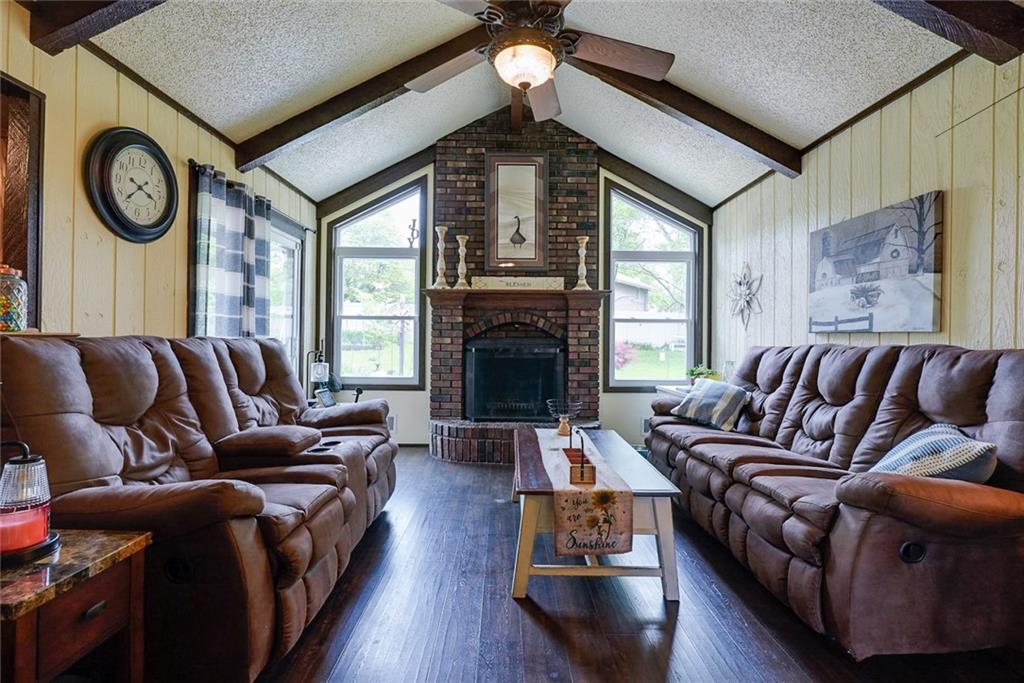 Vaulted ceiling with exposed beams, brick fireplace with wood mantel, dark wood-finish flooring, and natural light from multiple windows