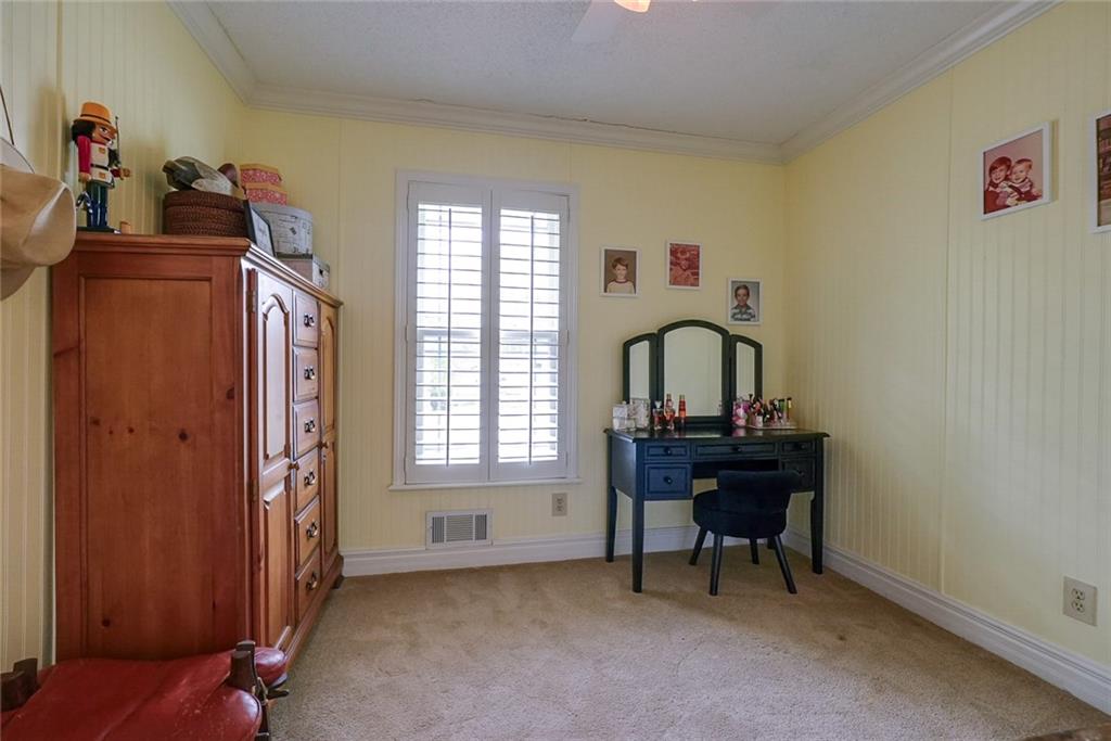 Bright room featuring a window with white plantation shutters, crown molding, and light-colored wall paneling