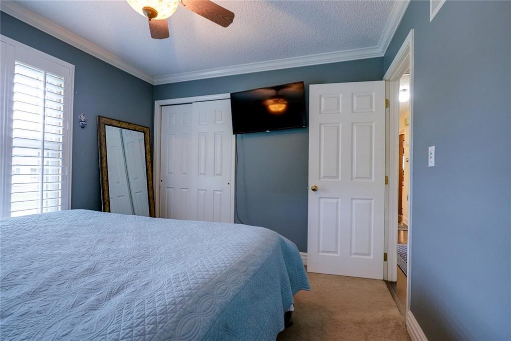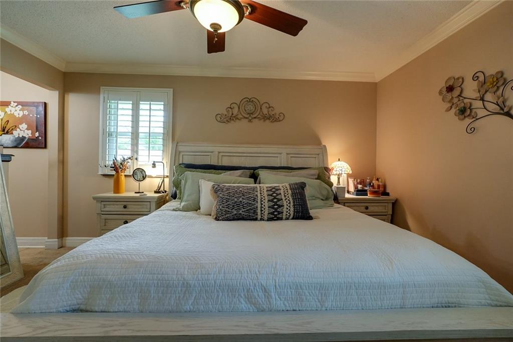 Bedroom featuring a dark wood bed frame, two windows with white plantation shutters, white crown molding, and a ceiling fan with integrated lighting