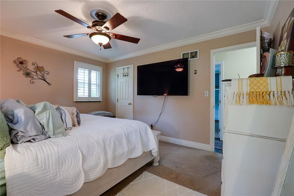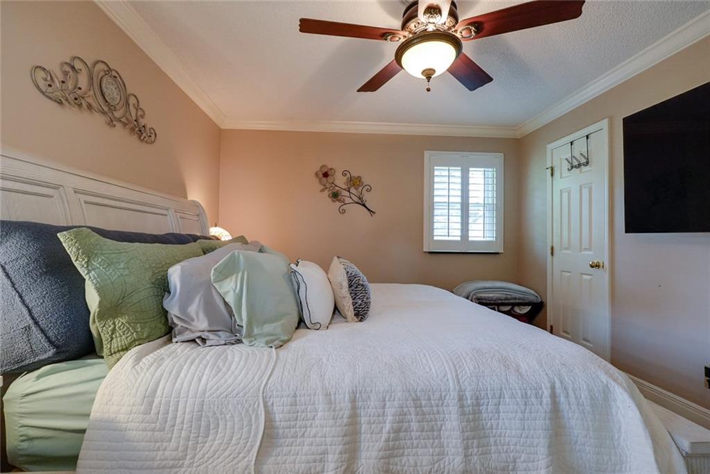 Neutral-toned bedroom featuring crown molding, a ceiling fan with light, a window with plantation shutters, and a wall-mounted television