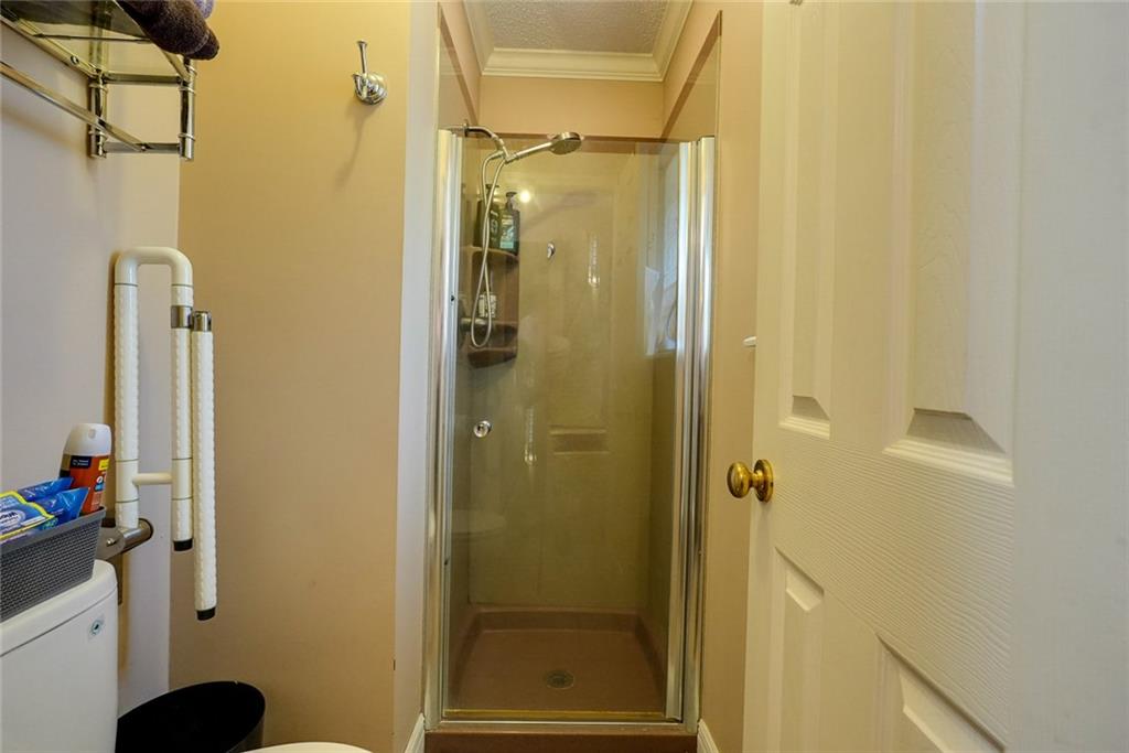 Full shower enclosure with a glass door, chrome frame, and built-in shelving
