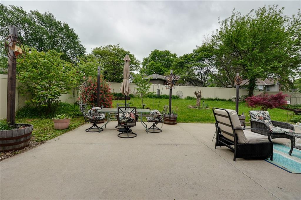 Spacious outdoor area featuring a concrete patio, verdant lawn, and mature trees