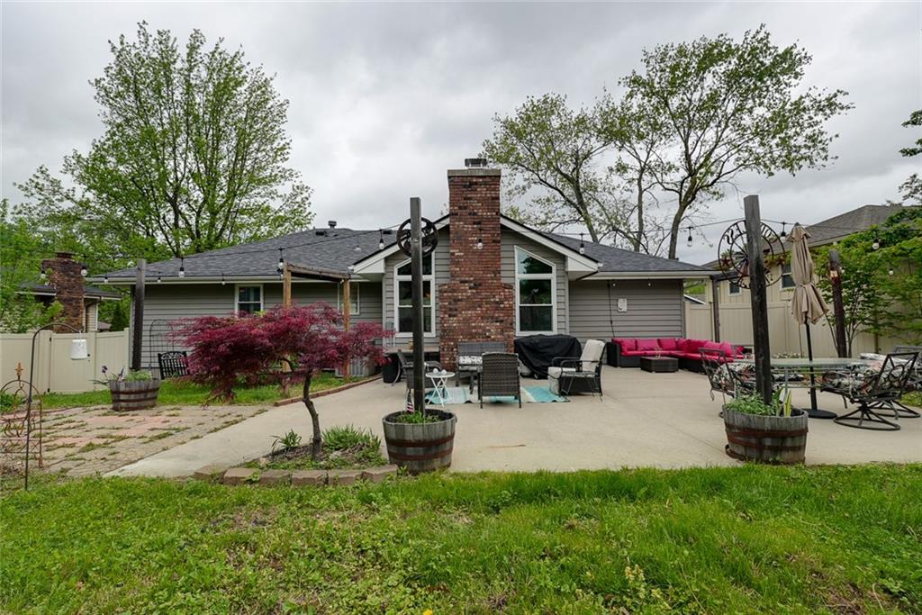 Spacious backyard with a large concrete patio, brick chimney, and a separate storage shed