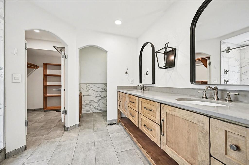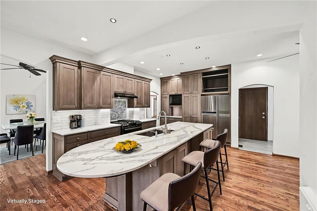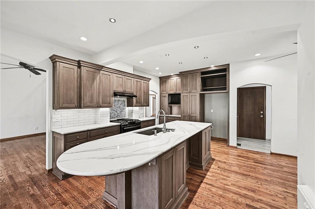 Located near the Lawrence Country Club, this expansive and beautifully maintained home offers exceptional space, updates and comfort throughout. The welcoming hardwood entry opens to an office with French doors. The spacious living room features gleaming hardwoods, a vaulted ceiling and a cozy fireplace. The oversized kitchen is a chef's dream-with quartz countertops, custom cabinetry, under-cabinet lighting, a gas range, built-in microwave, wine fridge and hardwood floors. There is an enclosed sunroom complete with ceiling fan, split heat/air and a nice doggie door. The main-level primary suite is spacious, has a massive walk-in closet and a wonderful, updated bathroom with a huge walk-in shower, custom cabinets and gorgeous tile flooring. A second main-floor bedroom has lots of room. There is a full bathroom in the hall with a wonderful skylight. There is a main floor laundry room as well as a laundry area in the lower level. The upstairs has two large bedrooms. The third bedroom has a large walk-in closet and beautiful plantation shutters. The fourth bedroom also boasts a nice walk-in closet. There is a bathroom on the second level that has a wonderful step-in shower. The lower-level walkout basement offers luxury vinyl flooring, a secondary kitchen with a huge island, sink and custom-built cabinets. The fifth bedroom is absolutely enormous with a large walk-in closet. There is a full bathroom in the lower level which makes this area perfect for guests or extended living. The lower-level walks out to a large patio. The big backyard has a gorgeous stone patio, pergola and a nice firepit. This home has beautiful landscaping, stone walkway in the front and a three-car garage. This stunning home combines abundant living space, quality craftsmanship, and a prime location near golf, trails, shops, schools and more. This is an ideal blend of luxury and comfort. Taxes and rooms sizes are approximate. Buyer to confirm schools and any information they deem important.