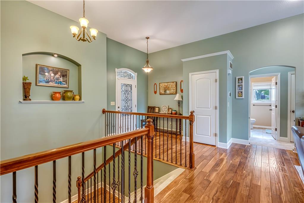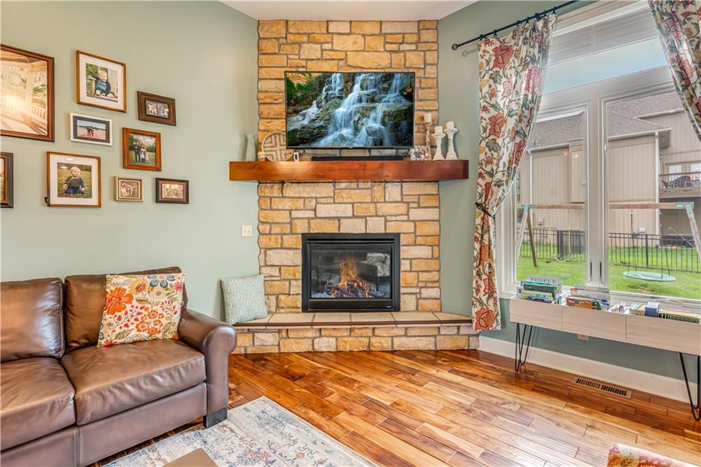 Your beautiful home is ready for you in the desirable Cayhill subdivision, known for holiday events, walkability, and commuting convenience to Whiteman AFB! This immaculate reverse ranch sits on a large corner lot with subdivision lake privileges, just minutes to shopping and restaurants in town. The welcoming front porch ushers you into warm hardwood hand-scraped floors and an open concept great room with tall ceilings. Enjoy the warmth of the gas fireplace with stone surround and still have connection to the Kitchen/Dining Room activities. Sellers have increased energy efficiency with window replacement in LR, DR, back secondary Bedroom, and hall Bathroom June 2025. Your large Kitchen has an abundance of custom wood cabinetry, granite counters, stainless steel appliances that all stay (Fridge, double oven, and dishwasher less than a year old!) and a dedicated pantry directly off the Kitchen. Main floor laundry is also nearby. The generous Primary Bedroom showcases a walk-in closet, newer carpet, and a beautifully updated on-suite Bathroom with new floor tile, newly tiled shower, new glass door, double vanity, and jetted tub. The two secondary Bedrooms have larger closets with storage systems and newer carpet with the hall Bathroom between. The lower level includes a full bar (drink fridge will stay) and service area off of the spacious Family Room, the 4th true Bedroom with a walk-in closet, another nonconforming room for many uses, and a 3rd full Bathroom. The 300 SF storage area includes a utility sink, storm shelter, NEW AC and furnace in 2025! Head out the patio door upstairs to the screened-in deck for relaxation without bugs! The basement patio leads up to the wide, newly stained back deck with a dedicated gas line for a firepit or grill. Play options abound with a swing-set and more in the fenced yard with in-ground sprinkler system. Come make new memories here!