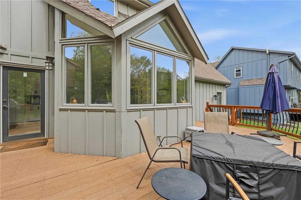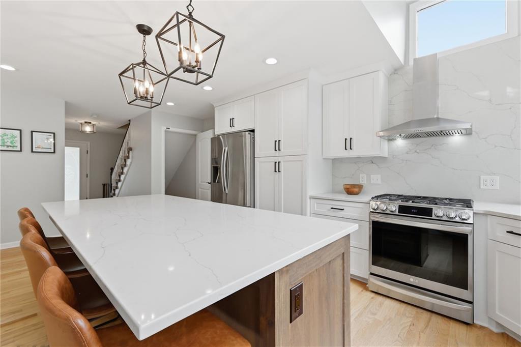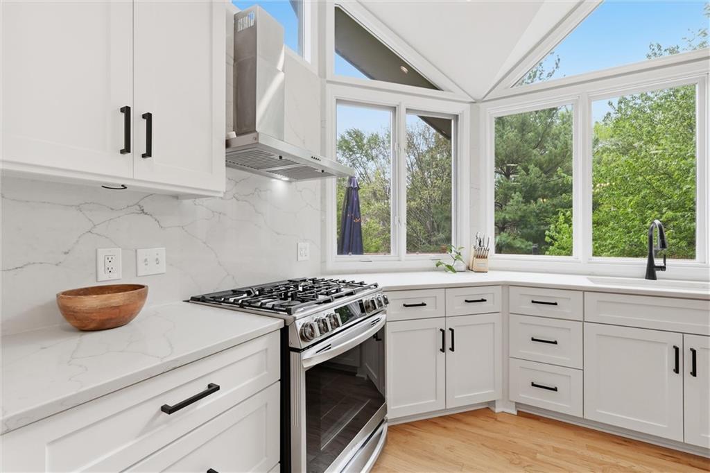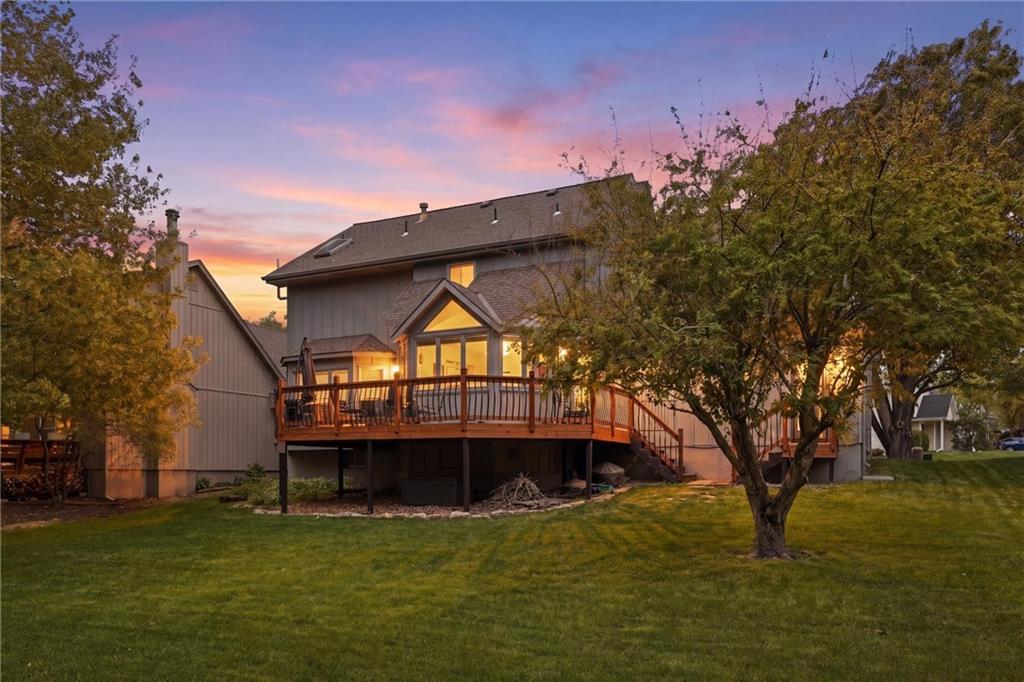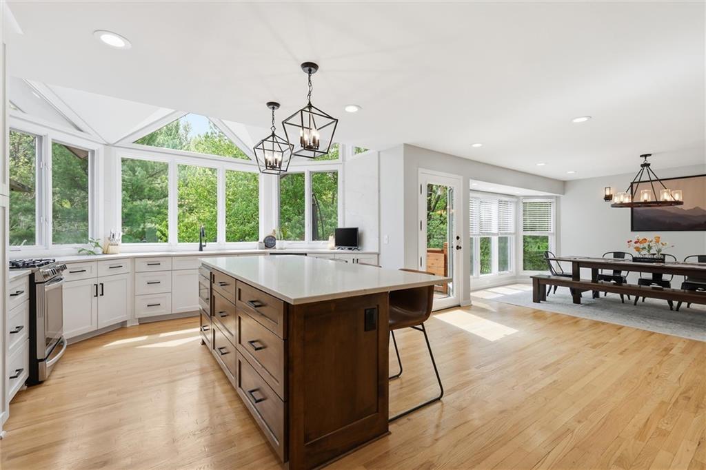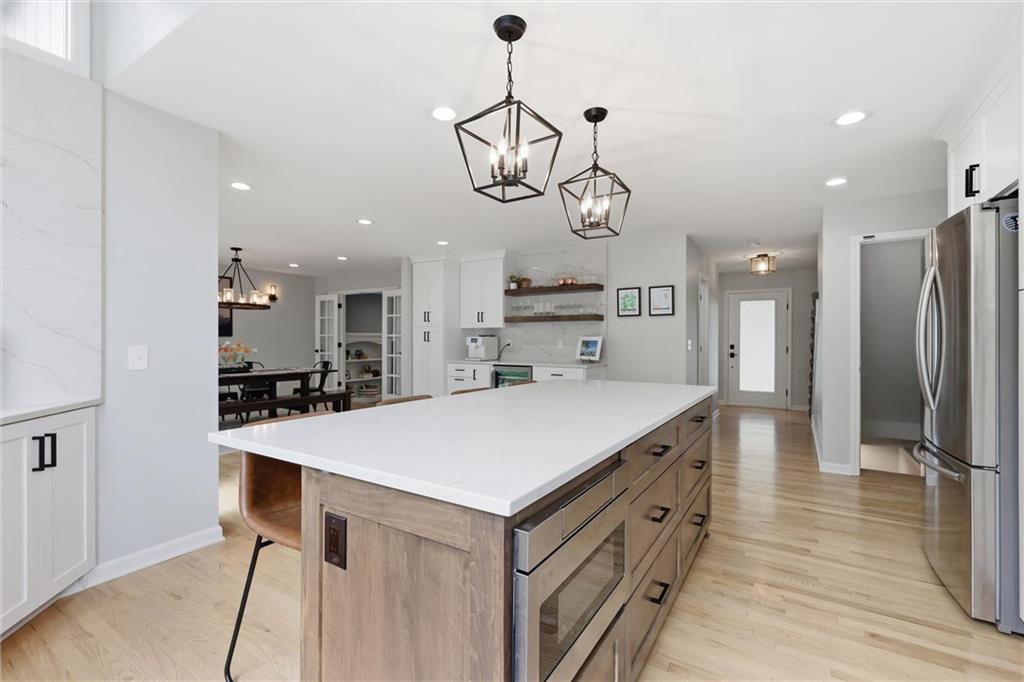 Welcome to Brookwood in Lenexa—where location meets lifestyle! Ideally situated with quick highway access, abundant nearby shopping & just minutes from the Lenexa City Center, this beautifully renovated home truly checks all the boxes. Lovingly updated by the current owners, nearly every surface has been thoughtfully refreshed. The show-stopping kitchen is sure to impress, featuring stainless steel appliances, a gas range with hood, a massive center island with quartz countertops & a stunning mix of stained wood cabinetry on the island paired with crisp white shaker cabinets along the perimeter. A charming bay window, bar area with a beverage center & floating shelves, and updated lighting complete the space. The adjacent dining area offers plenty of room to gather and is highlighted by a chandelier. Refinished hardwood floors flow throughout most of the main level, where you’ll also find a spacious carpeted living room with a fireplace and built-in shelving. The updated powder bath features a new vanity, mirror, lighting, and a shiplap accent wall. Step outside to the large deck that is set up with gas lines for a grill and firepit—perfect for entertaining & enjoy the privacy this lot provides. There is a greenbelt behind the house! Upstairs, you’ll find three generously sized secondary bedrooms, all with ceiling fans, including one with an incredible walk-in closet. The primary suite features a tray ceiling, a fireplace, dual closets, and a beautifully remodeled bathroom with a spa-like custom tiled shower, double vanity, updated lighting, mirrors & a full tile backsplash. The secondary full bathroom has also been updated with a stylish vanity, hexagon tile flooring, and newer fixtures. Convenient second-floor laundry makes everyday living easy. The finished lower level adds even more living space, complete with a wine closet and additional storage. This is a fantastic opportunity to own a move-in ready home in one of Lenexa’s most desirable areas—don’t miss it!