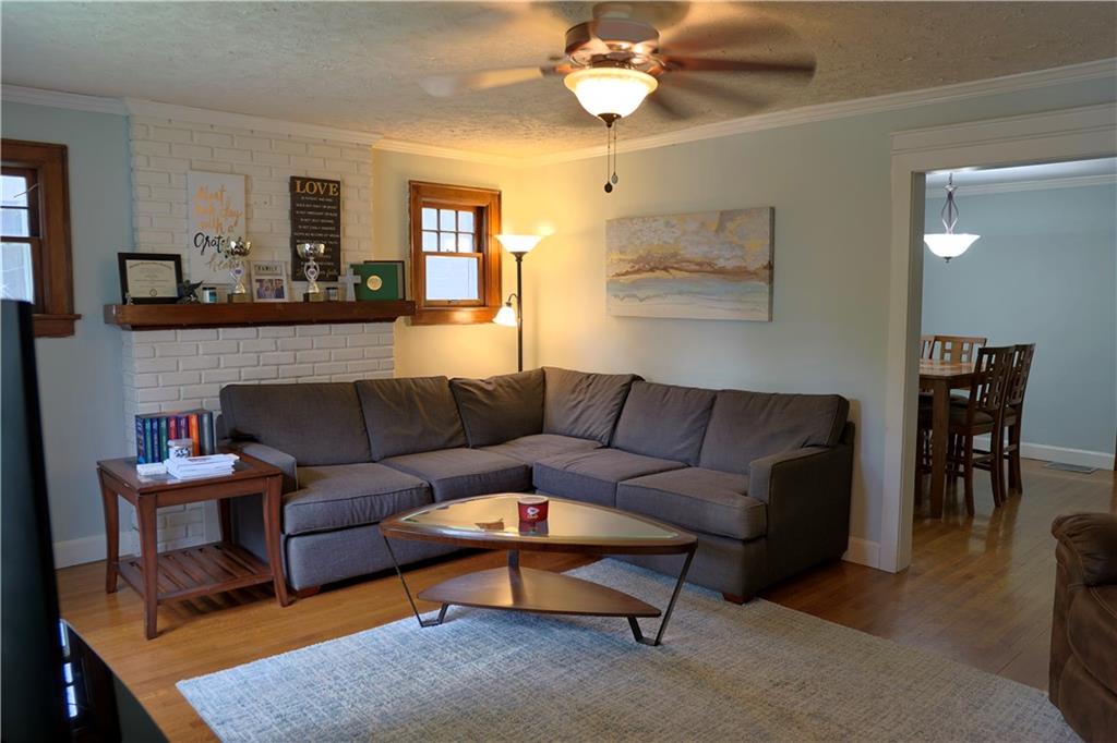 Welcome home to this inviting ranch, ideally located on corner lot in highly desirable neighborhood filled with historic charm. Walking distance to City Park, schools and up and coming Harrisonville Square. Hardwood floors in Living area w/ fireplace flanked by charming original pane windows and adjoining dining room. Kitchen w/ gas range & microwave & dishwasher. Two spacious bedrooms & nicely updated hall bath. Full basement w/ 2nd full bath. Fenced yard with covered patio. Two car garage.