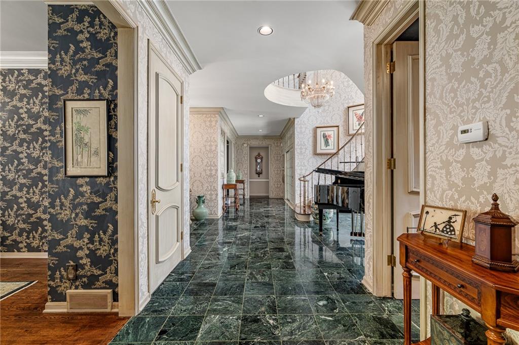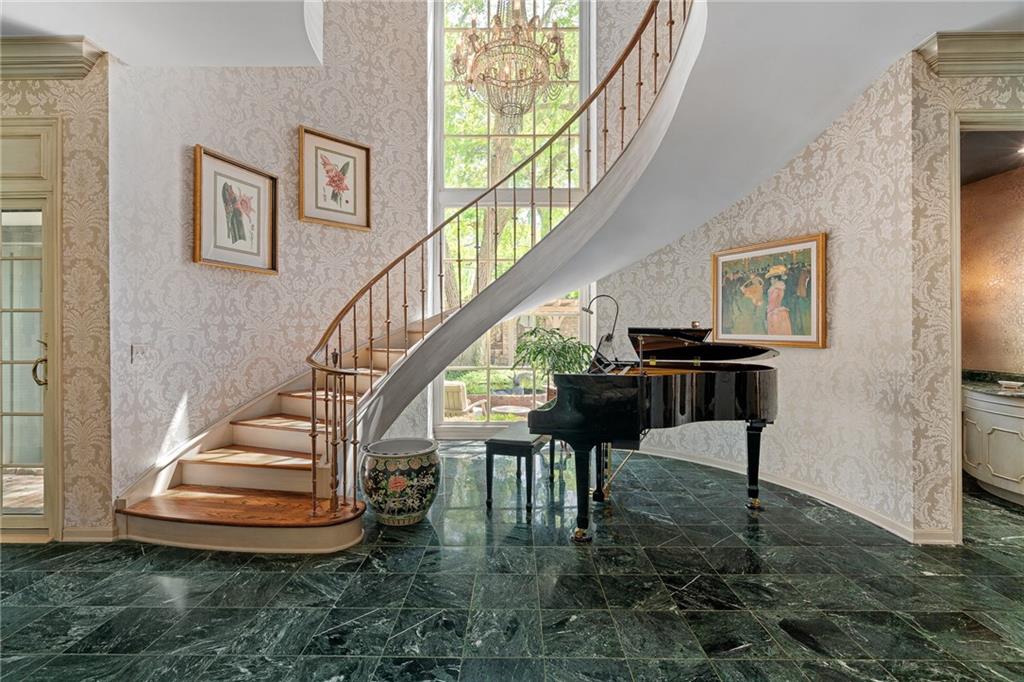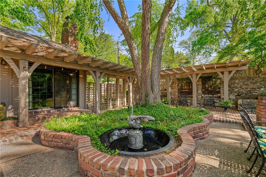 Imagine your own private chateau in the heart of Mission Hills-an extraordinary residence where timeless elegance and impeccable care come together in perfect harmony. From the moment you arrive and are greeted by the sweeping curved staircase in the entry, you know you are in for a treat of grandeur and warmth that really must be experienced in person.Soaring ceilings and beautifully proportioned rooms create and ideal setting for entertaining on any scale, yet the home remains inviting and comfortable for everyday living. At its heart, a truly special feature unfolds: a stunning U-shaped design embracing a brick-paved garden courtyard, complete with pergolas and fountains. This picturesque piazza offers an enchanting backdrop for celebrations, quiet evenings, or unforgettable gatherings under the stars. The spacious family room is a true showplace, featuring a vaulted, beamed ceiling, a striking fireplace as its focal point, and a well appointed wet bar-perfect for effortless entertaining with direct access to the piazza. The main level offers remarkable flexibility, with a serene primary suite featuring a barrel ceiling, fireplace and a beautiful view and access to the piazza. Two additional main-floor bedrooms share a bath, creating the opportunity for dual primary living on the same floor. Upstairs, two more bedrooms share a bath, ensuring there is truly room for everyone. The lovely eat-in kitchen is both functional and inviting, featuring a gas range, wine cooler, refrigerator drawers, and pantry. It opens to another, more intimate courtyard-an ideal setting for grilling, quiet mornings, or a relaxed evening in a private outdoor space. Storage is abundant throughout the home with an impressive number of large closets. This home also features a highly sought-after large three car garage with epoxy flooring. A versatile space just off the kitchen, currently an office with ensuite bath, offers potential for private quarters for live-in assistance. A magical home