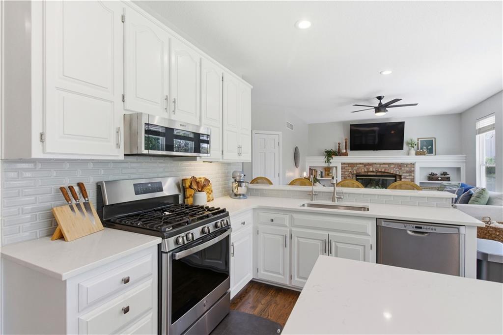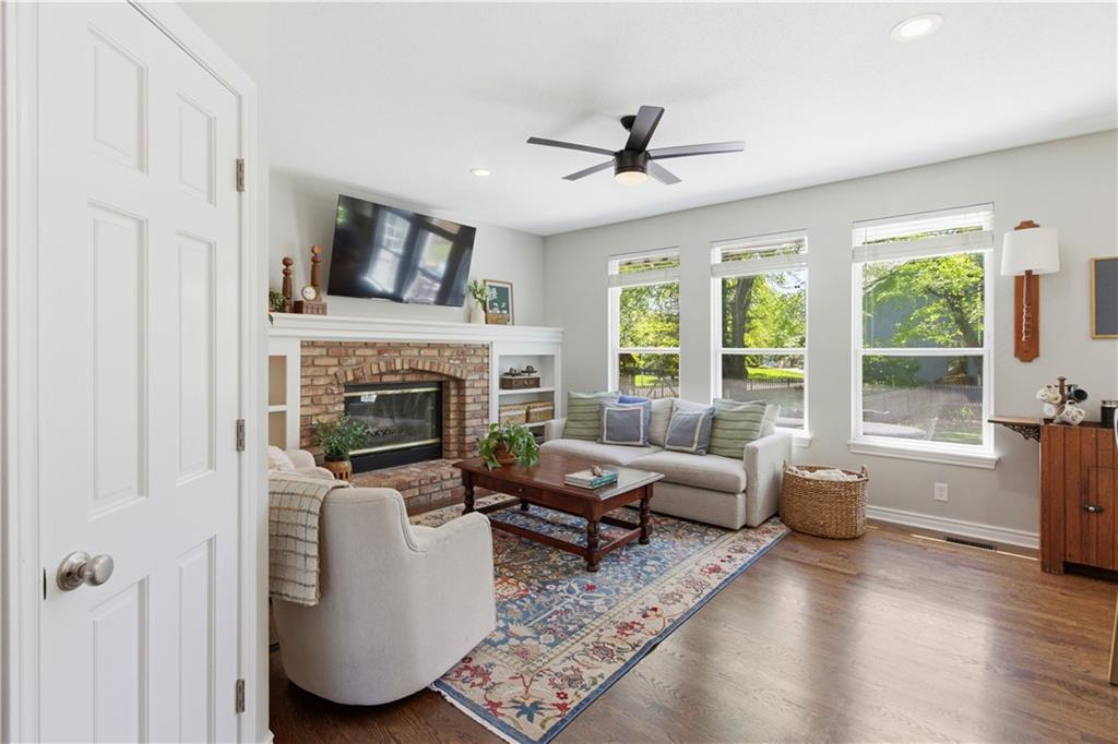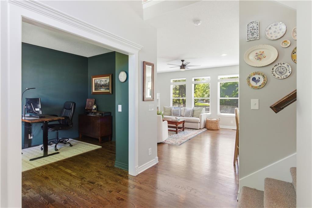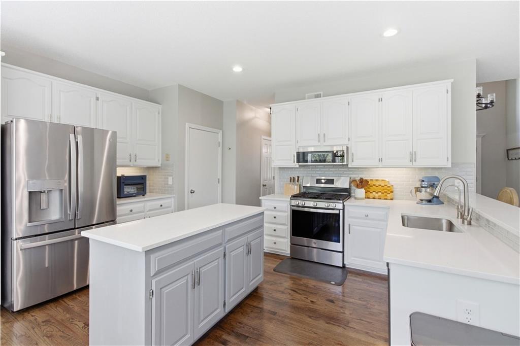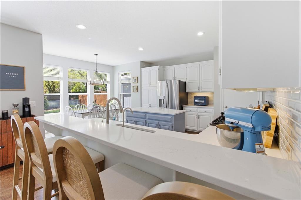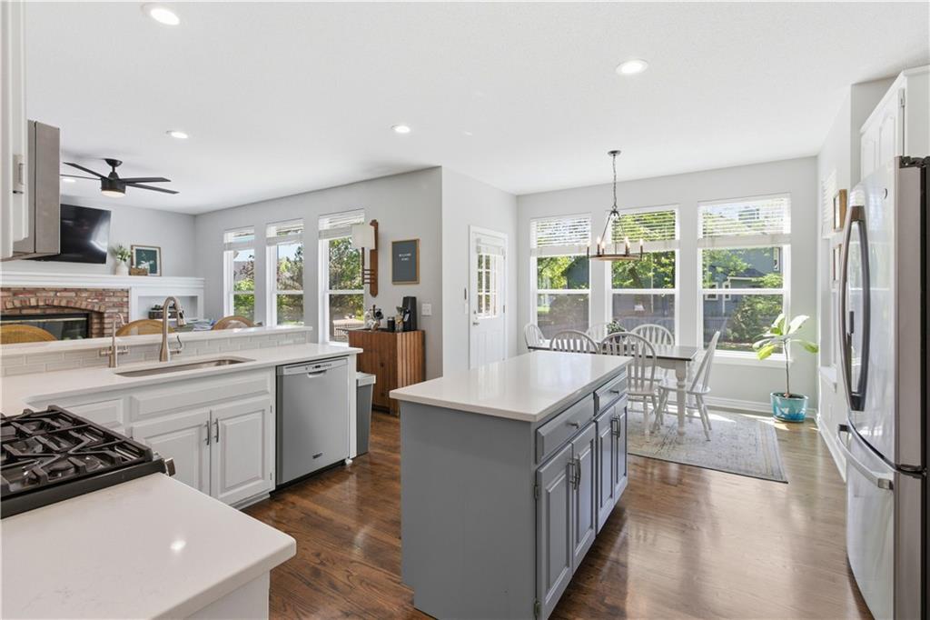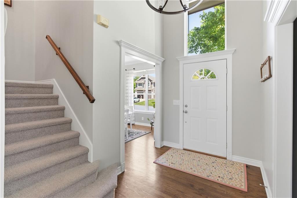 Meticulously maintained home offering exceptional curb appeal with updated landscaping and sprinkler system front and back. Cul-de-sac tucked inside the Eastbrooke subdivision. Inside, enjoy a formal living room with custom built-ins and a stunning fireplace, plus a versatile front flex room. The remodeled kitchen boasts white cabinetry, quartz countertops, designer tile backsplash, gas range, and spacious eat-in area flooded with natural light. SO much space in this kitchen, plenty of cabinets/counter space. Reverse osmosis water filter at kitchen sink. Smart home features include ring cameras, smart garage and thermostat. Beautiful wood floors flow throughout the main level. Half bath with beautiful tile! Upstairs, the spacious master suite features a luxurious bathroom with heated tile floors and impressive walk-in closets. Separate tub/shower and dual vanities. Secondary bedrooms are generously sized with updated bath. The finished lower level provides ample living space with a rec room, custom built-ins, study nook, and abundant storage including a battery backup sump pump. The expansive fenced backyard includes a spacious patio, vibrant landscaping, level yard space, and a custom workshop off the garage. Great for tool storage or wood shop. Neighborhood trails connect to the Indian Creek Trail system. This home is truly move-in ready and close to schools, shopping, dining and more!