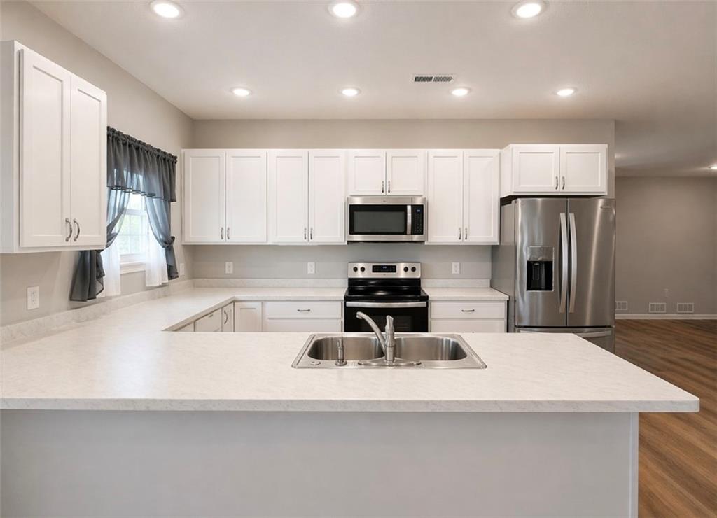 Rare find! This beautifully maintained, like-new one-level townhome offers a spacious open floor plan with 3 bedrooms and 2 full bathrooms—perfect for comfortable, easy living. Enjoy the convenience of a large attached garage featuring an oversized 18' x 8' door, ideal for taller or larger vehicles. The home includes durable laminate flooring throughout, creating a clean, modern look with low maintenance. The spacious bedrooms provide ample closet space, and you'll appreciate the abundance of storage throughout the home. All appliances and window treatments stay, making this truly move-in ready. The primary suite boasts a spacious en suite bath and a large wail-in closet. Recent upgrades add peace of mind, including a roof with a remaining 2-year warranty and energy-efficient triple-pane windows with a lifetime transferable warranty for the new owner. Designed with accessibility in mind, this home is handicap accessible and offers the ease of single-level living. Situated on the edge of town, you’ll enjoy beautiful landscaping and a quiet setting.