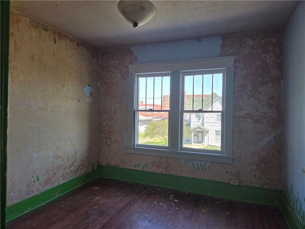 Room featuring wood-finish flooring, a single window with white trim, and light gray walls