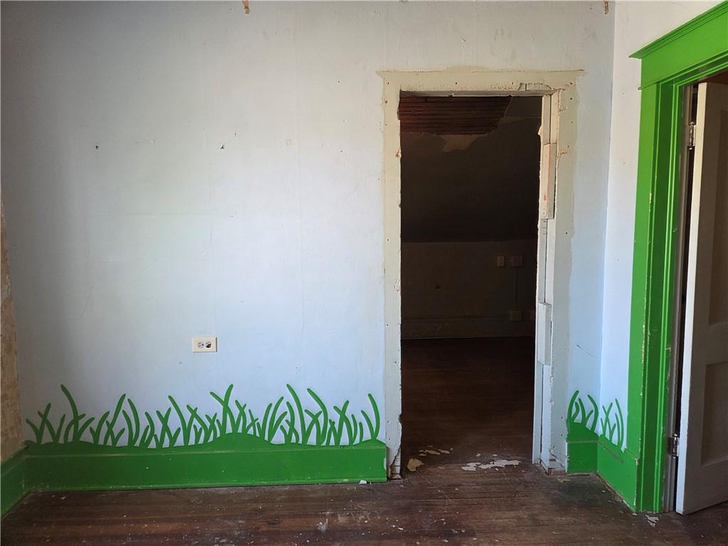 Room featuring wood-finish flooring, a two-pane window with dark wood trim and security bars, and a multi-pane glass-inset door