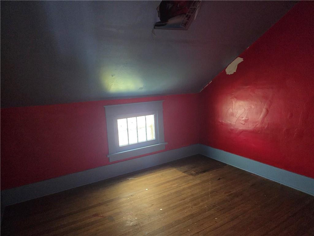 Room featuring sloped ceilings, a built-in wood-finish closet with hanging rod, and wood-finish flooring