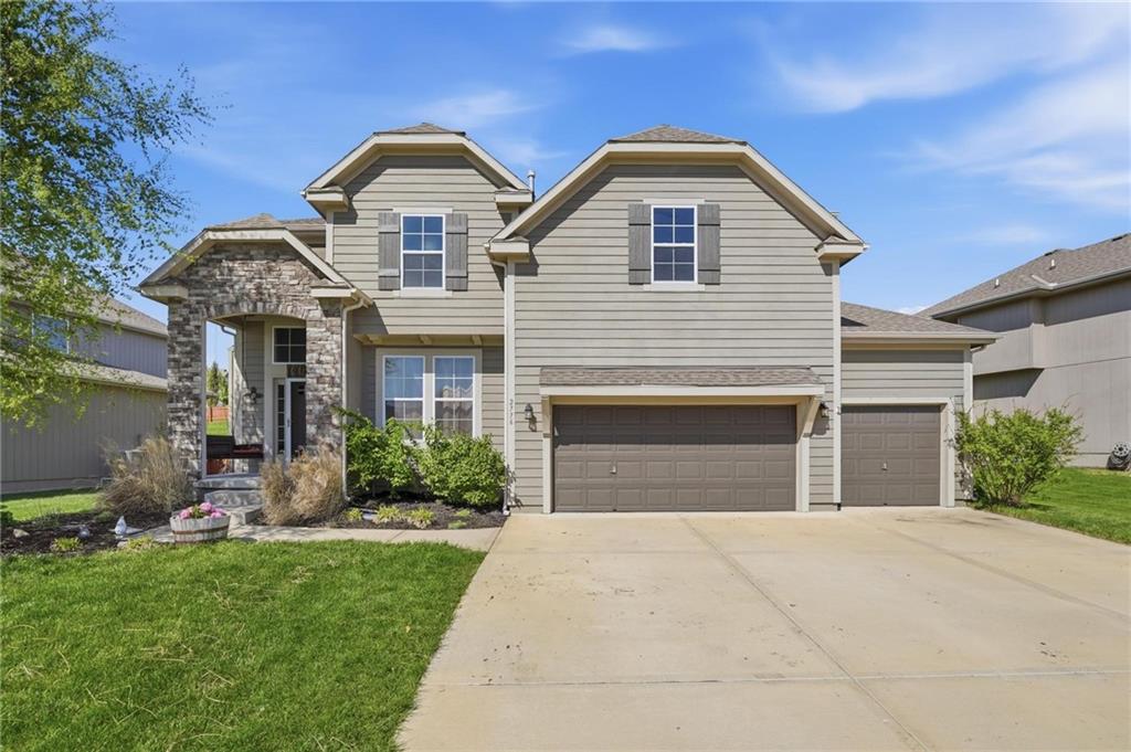 This beautifully maintained 4-bedroom, 3.1-bath home offers the perfect blend of comfort, style, and everyday functionality in a highly desirable Olathe location. From the moment you arrive, the charming front porch sets a welcoming tone, leading into a bright and airy interior with soaring ceilings and an inviting entryway. The main living area is filled with natural light and features a cozy fireplace, creating an ideal space for both relaxing and entertaining. The open-concept layout flows seamlessly into the kitchen, where granite countertops, a large island, ample cabinetry, and a new microwave make both cooking and gathering effortless. Fresh new carpet enhances the home’s clean, updated feel, while thoughtful design elements throughout provide both style and practicality. Upstairs, the spacious primary suite offers a peaceful retreat with a tray ceiling and a well-appointed en-suite bath. Additional bedrooms provide flexibility for family, guests, or home office needs. A versatile loft area with built-in shelving adds even more functional living space. Step outside to enjoy the newly landscaped yard with freshly laid sod, offering plenty of room to relax or play. The outdoor living area is perfect for entertaining, complete with a patio and outdoor TV for enjoying evenings at home. The unfinished basement presents a fantastic opportunity to customize additional living space to suit your needs. Ideally situated near shopping, dining, and everyday conveniences while still offering a quiet, neighborhood feel, this home combines location, community, and livability in one exceptional package.