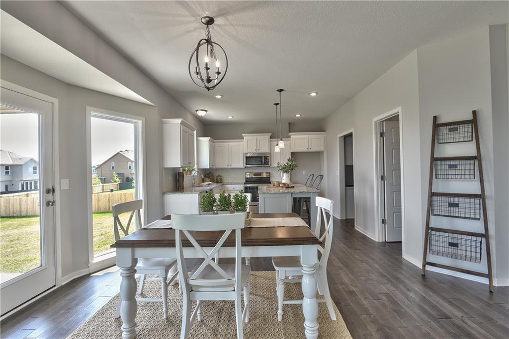 Welcome to the Paxton III by Prieb Homes. This 2 story plan begins with a wonderful front porch leading you into this open floorplan. Nice entry with U-shaped staircase is open to the formal dining room with trayed ceiling. Great room with gas fireplace enjoys the natural light streaming through the windows. The center island kitchen is sure to please, featuring granite countertops, apron sink, custom cabinets with soft close drawers & doors, upgraded cabinet hardware, cabinet hood & built in microwave, stainless appliances and a large walk in pantry. Beautiful hardwood floors run throughout the entry, kitchen, breakfast room and mud room. Walk out of the breakfast room onto the covered patio to enjoy the outdoors. Large first floor guest room with closet can be used as an office, playroom, sewing/craft room, etc. Convenient 3/4 bath is adjacent to the guest room and mud room with boot bench and entry closet. Upstairs you will find three more bedrooms, one with its own private bath. The other two bedrooms share a Jack & Jill bathroom with a large vanity & double sinks. All bedrooms have vaulted ceilings. The owner's suite is a spacious room with double doors & vaulted ceiling. The lovely bath is a quiet retreat with a tiled walk-in shower, separate tub, two separate vanities, linen closet and tile floors. Attached is a large walk-in closet leading into the laundry room which is also accessible from the hallway with built-in bookshelves. Incredible unfinished basement with tons of storage and 3/4 bath stub. Three car garage and sprinkler system. Prairie Farms is adjacent to the newly renovated Lake Olathe offering tons of outdoor activities. Large community pool, cabana, play area and walking trails. Conveniently located close to schools, shopping, grocery stores, restaurants and highways. Photos are of previous homes and may show some optional features.