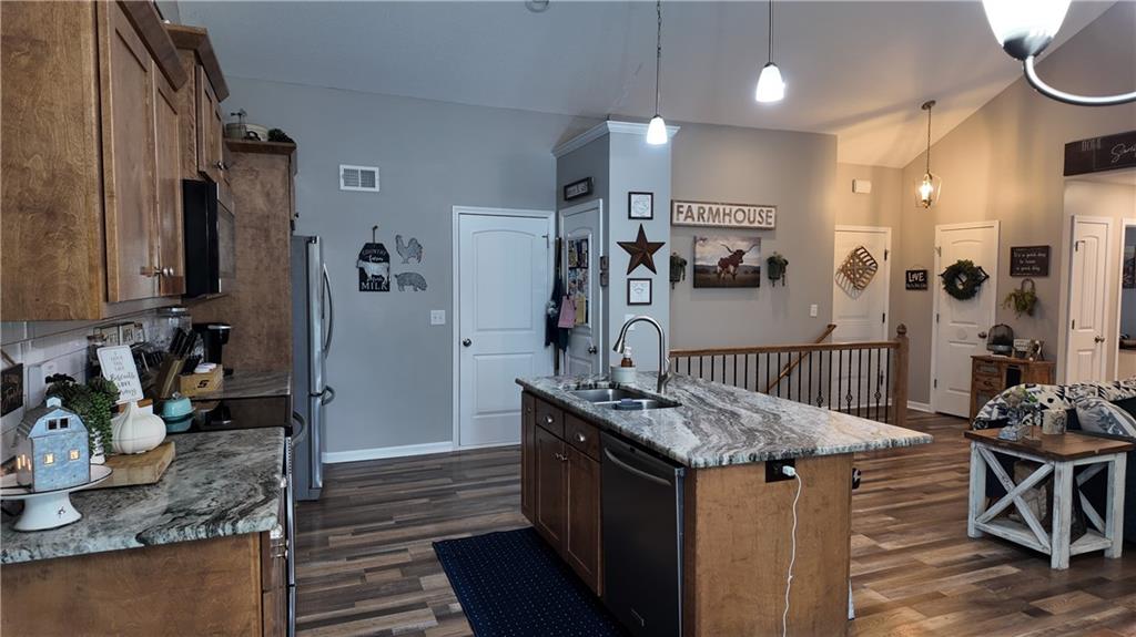 This beautifully maintained 5-bedroom, 3-bath home offers the perfect blend of space, functionality, and modern upgrades. With three bedrooms upstairs and two conforming bedrooms in the fully finished basement, there’s plenty of room for family, guests, or a home office setup. The open-concept main living area features a cozy gas fireplace and flows seamlessly into the kitchen, complete with stainless steel appliances, granite countertops, and stylish finishes throughout. Luxury vinyl plank (LVP) flooring runs through the entire home, providing durability and a clean, modern look. The spacious primary suite boasts a vaulted ceiling in the master bath, along with a relaxing jetted tub—perfect for unwinding at the end of the day. Downstairs, the fully finished basement offers incredible additional living space, including a large family room, two bedrooms, and a full bathroom—ideal for entertaining or multi-generational living. Car enthusiasts, hobbyists, or anyone needing extra workspace will love the custom garage featuring 12-foot ceilings, 220V power, a loft for additional storage, and a third bay door that opens to the backyard. The extended third driveway pad provides even more parking flexibility. Outside, enjoy a fully fenced backyard complete with a large shed for extra storage. The home’s exterior was freshly painted just two years ago, adding to its curb appeal and overall value. This home truly checks all the boxes—space, upgrades, and versatility—ready for you to move in and make it your own.