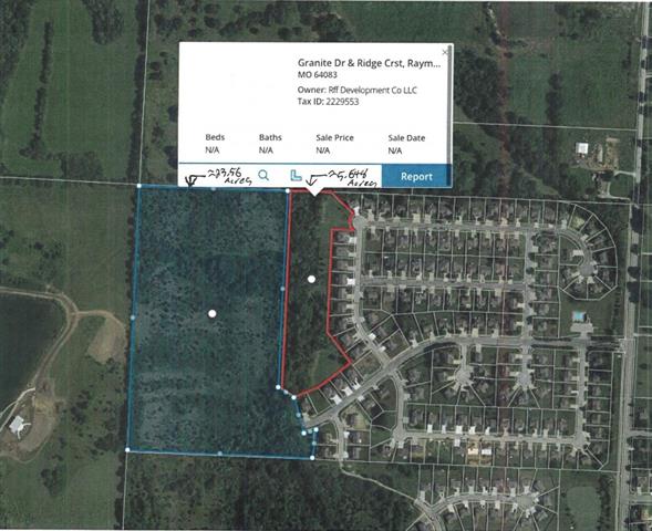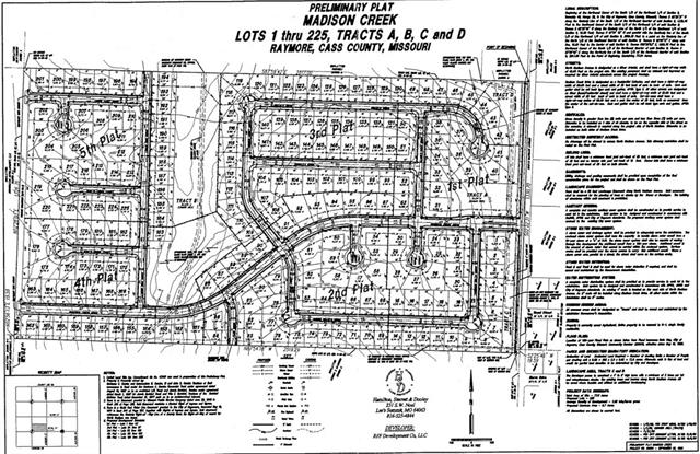 Two Parcels side by side adding up to just under 30 acres of GREAT potential development land in the Madison Creek Subdivision area. This property backs up to one of Raymore's city parks and ponds, quick access to local shopping areas and very near the esteemed Creekmoor Golf Coarse. Seller intends to sell both Parcels together and does not wish to divide these up or sell them separately. Attached is the original preliminary plat (now expired) and the most recent 3rd Final Plat though expired this should give a good idea of what is here to work with. For development, the City will require 1 stream crossing to connect Madison Creek Drive west to the future extension of Sunset Lane. Development along the existing stream in Madison Creek will be required to meet the stream buffer requirement (Order 1 stream requires a 50-foot buffer from the top of bank of stream on each side of stream). City has approved funding for the extension of Sunset Lane north from 58 Highway to 163rd Street and to connect 163rd Street west to its current terminus. This project is currently under design and scheduled for construction in 2022. Only the necessary right-of-way will be required of the developer. The City is also hoping (not yet approved) to extend a water main north along Sunset Lane to serve the Hawk Ridge Park area to the west, which would also serve the Madison Creek undeveloped area. The property is currently zoned R-1 Single-Family Residential. See attached brochure for district standards. *Buyer and buyer's agent to verify all listing information, lot sizes, tax info, plat information, and land use*