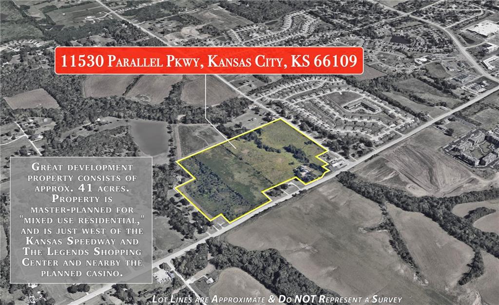 This great development property consists of approx. 41 acres. Property is master-planned for "mixed use residential," and is just west of the Kansas Speedway and The Legends Shopping Center and nearby the planned casino. Perfect location for apartments or a church, any type of institutional user as well as multi-family or residential. Great location -Property is development ready and close to highway and in the path of development. There is a home on the property that is currently rented - please do not disturb. Great garage space and two barns.