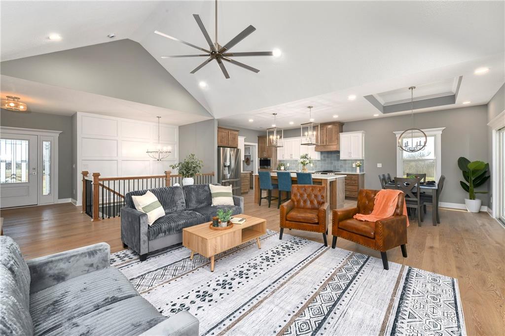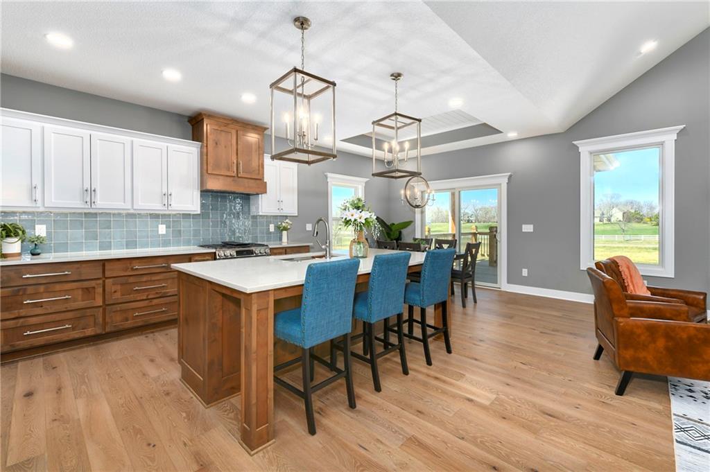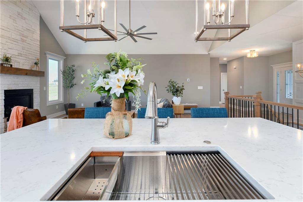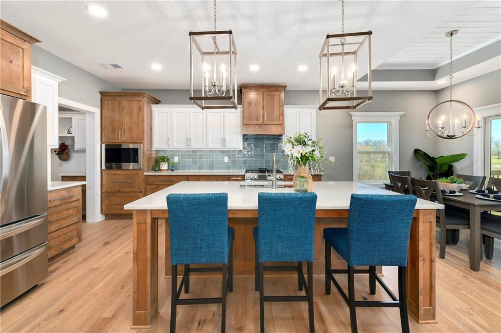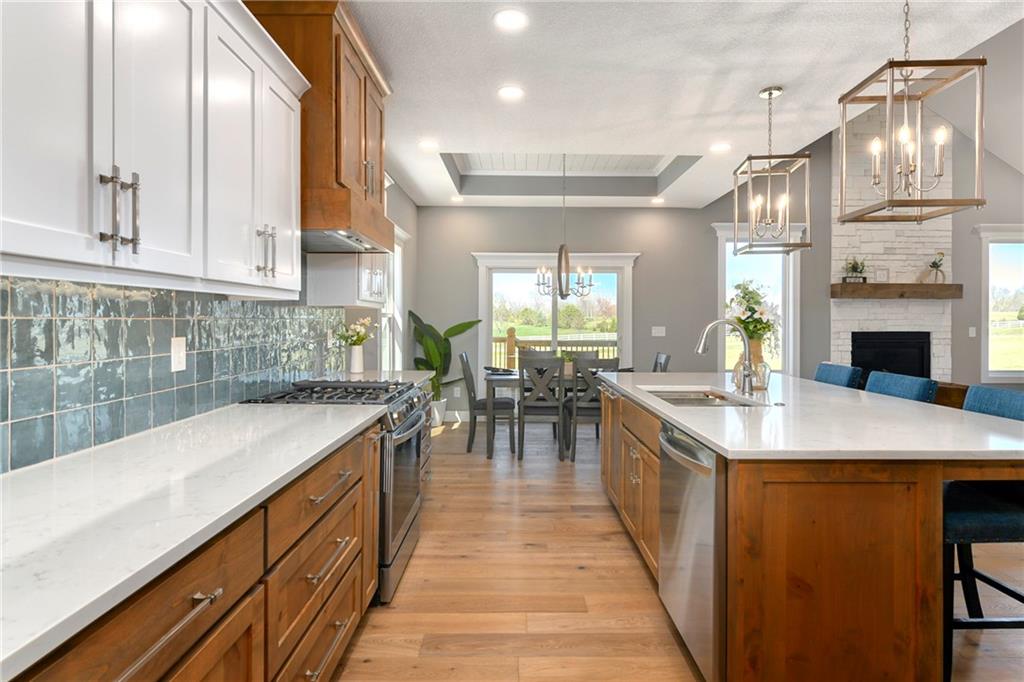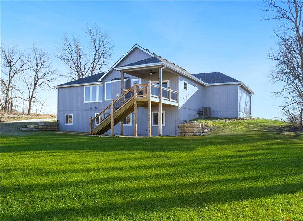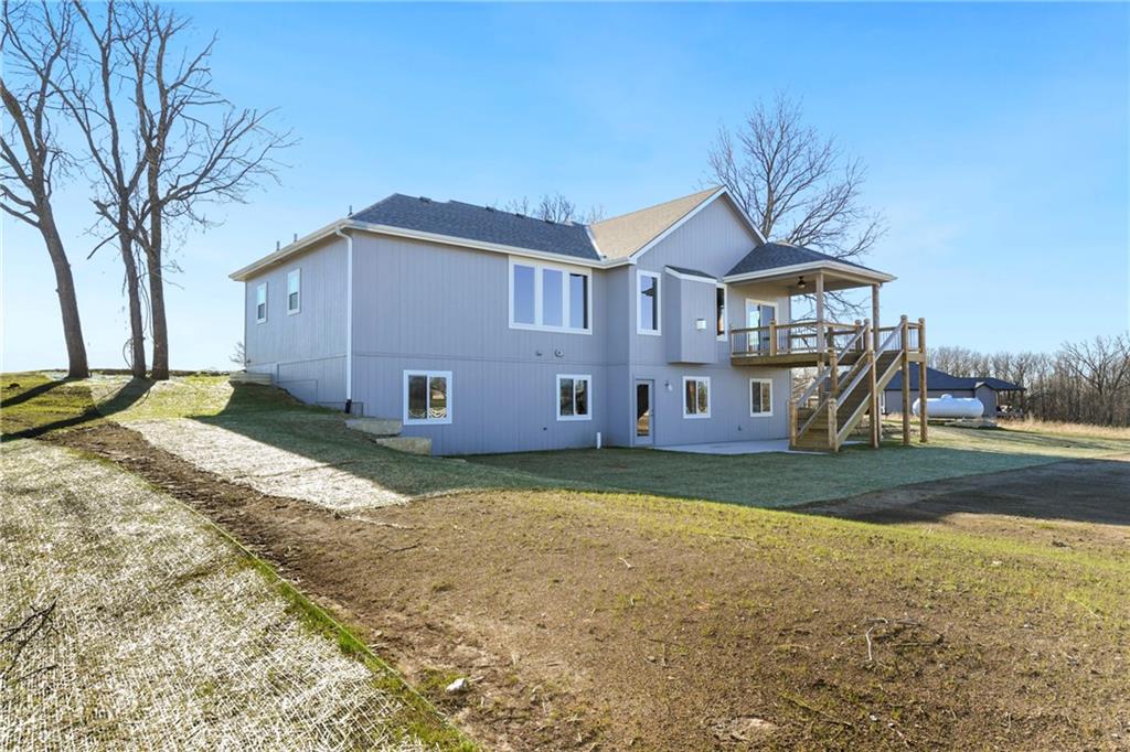 NEW HOME, MOVE IN READY! This Beautiful, Reverse Walk-out Ranch Home sets outside of City Limits on 2.5+ acres in the lovely Emerald Estates! This HOME is a GOLD Award winner in the Parade of Homes, Marco reverse 1.5 story / ranch plan by PCDI Homes! You will fall in love with all the custom detail in this home. The kitchen hosts a 7.5 foot island with quartz counters, a gas range with wood range hood, walk in pantry, soft close drawers and custom cabinetry, and a refrigerator! Just off the kitchen is a mudroom drop zone with bench and a oversized 3-car garage that has a workshop area and is 24' deep. Primary suite is on the main level with box vault ceiling, a bathroom suite with separate vanity areas, large walk-in closet and tiled shower with dual showerheads! A convenient additional guest bedroom suite on main level, 3 more bedrooms downstairs and a flex room for your home gym, crafts or office. Walk out basement to large concrete patio, covered deck with stairs to your amazing private estate lot. Outbuildings are allowed! Plenty of room for your pool and building! Emerald Estates is conveniently located right outside of the City Limits , so close to all the shopping, less than 20 minutes from Ft Leavenworth, VA Hospital, and so close to everything KC! Lansing Schools!