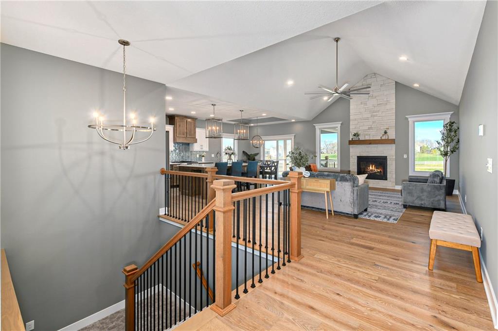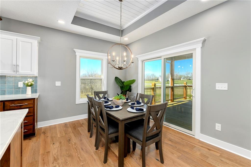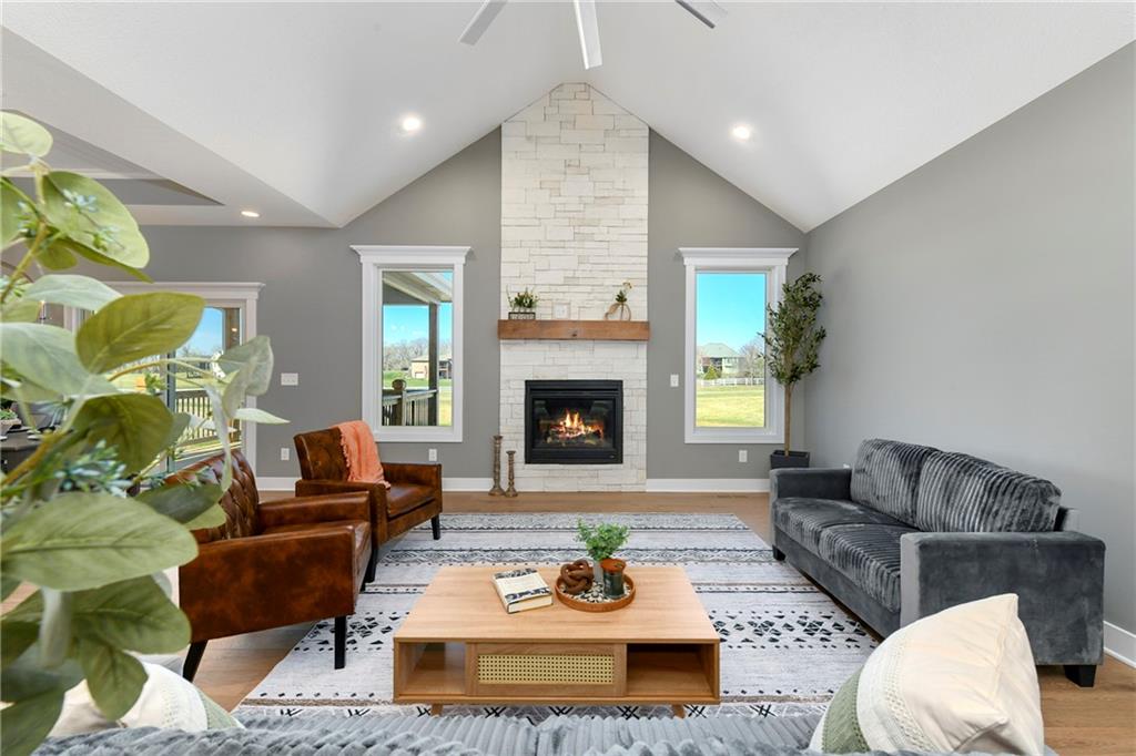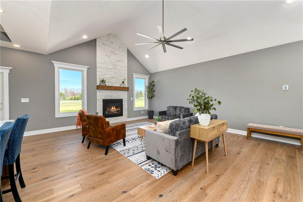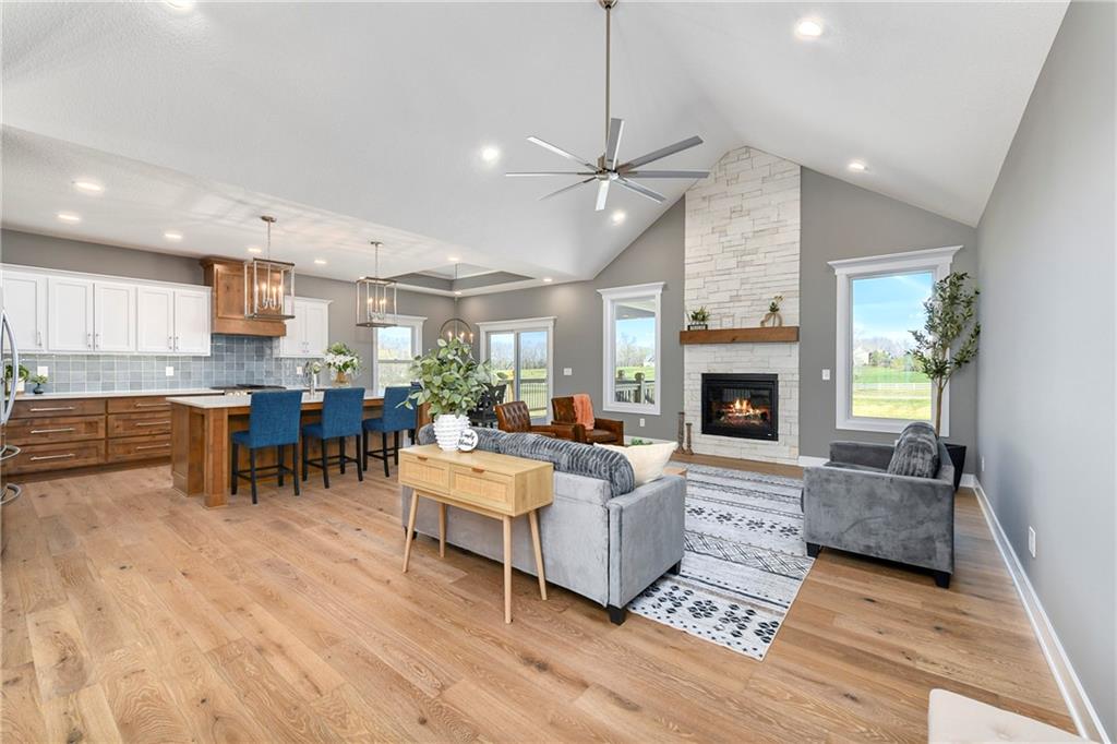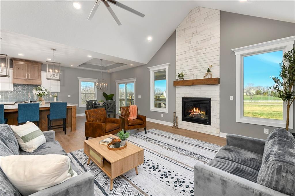 NEW HOME, MOVE IN READY! This Beautiful, Reverse Walk-out Ranch Home sets outside of City Limits on 2.5+ acres in the lovely Emerald Estates! This HOME is a GOLD Award winner in the Parade of Homes, Marco reverse 1.5 story / ranch plan by PCDI Homes! You will fall in love with all the custom detail in this home. The kitchen hosts a 7.5 foot island with quartz counters, a gas range with wood range hood, walk in pantry, soft close drawers and custom cabinetry, and a refrigerator! Just off the kitchen is a mudroom drop zone with bench and a oversized 3-car garage that has a workshop area and is 24' deep. Primary suite is on the main level with box vault ceiling, a bathroom suite with separate vanity areas, large walk-in closet and tiled shower with dual showerheads! A convenient additional guest bedroom suite on main level, 3 more bedrooms downstairs and a flex room for your home gym, crafts or office. Walk out basement to large concrete patio, covered deck with stairs to your amazing private estate lot. Outbuildings are allowed! Plenty of room for your pool and building! Emerald Estates is conveniently located right outside of the City Limits , so close to all the shopping, less than 20 minutes from Ft Leavenworth, VA Hospital, and so close to everything KC! Lansing Schools!