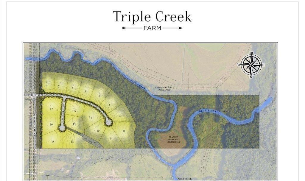 Lot 12 Triple Creek Farm. Hurry to be part of the newest Blue Valley acreage estate lot community, Triple Creek Farm, created by Quinn Real Estate Co. known for Wolf Valley and The Farm at Garnet Hill among other great high-end neighborhoods. There will only be an exclusive offering of 17 lots on Thirty-Eight acres surrounded by Thirteen gorgeous, heavily wooded acres, secluded private parkland running alongside where the Coffee Creek and Wolf Valley meet. It adjoins the new JoCo streamway parkland. This is actually the headwaters of the formation of the Little Blue River that begins here and flows all the way to Swope Park. To view photos of the property and 13 acres of unspoiled, heavily wooded private parkland with groomed walking and mountain biking trails.