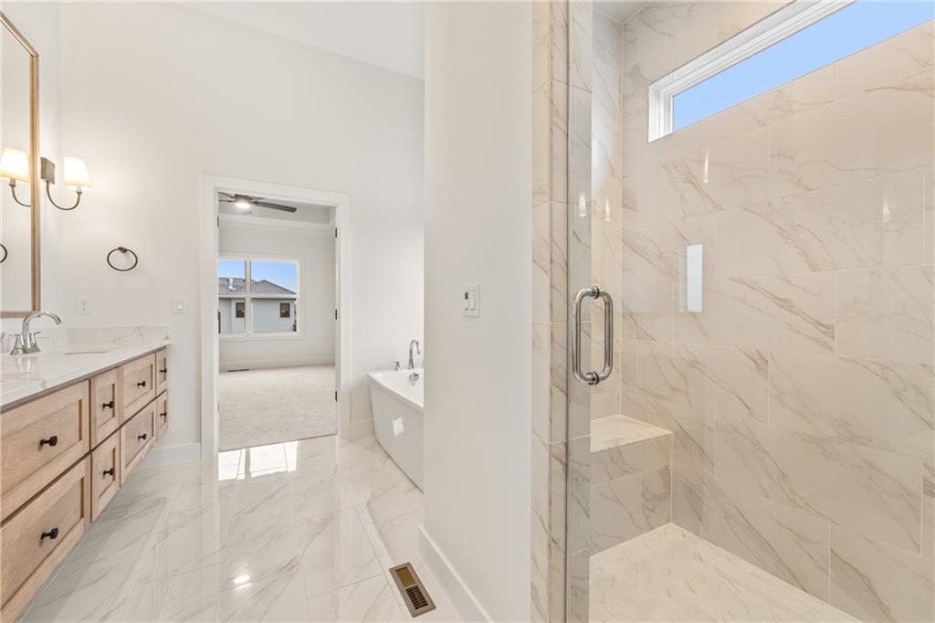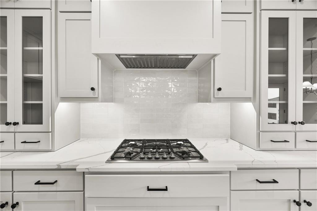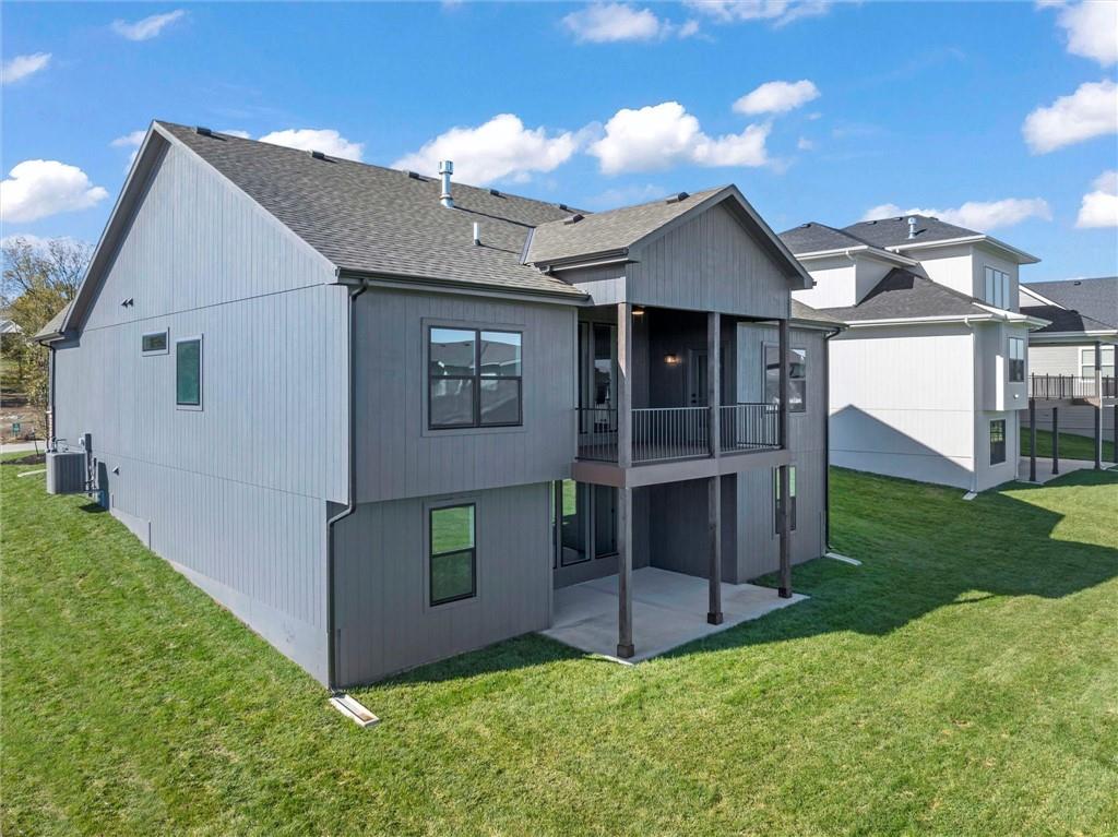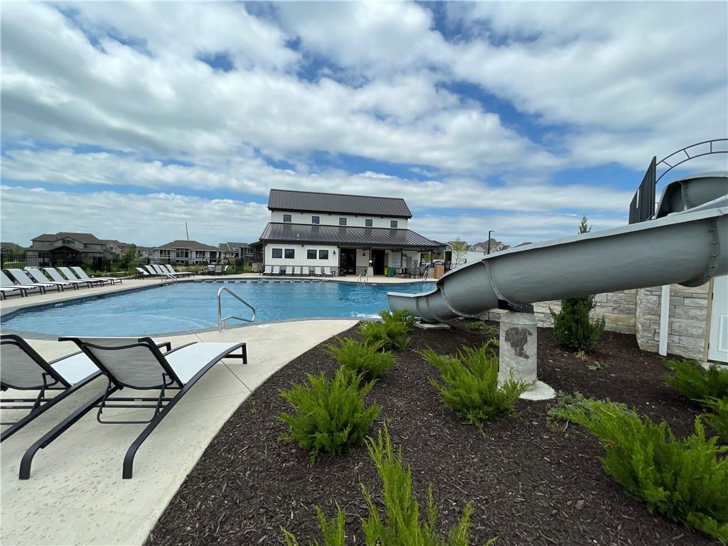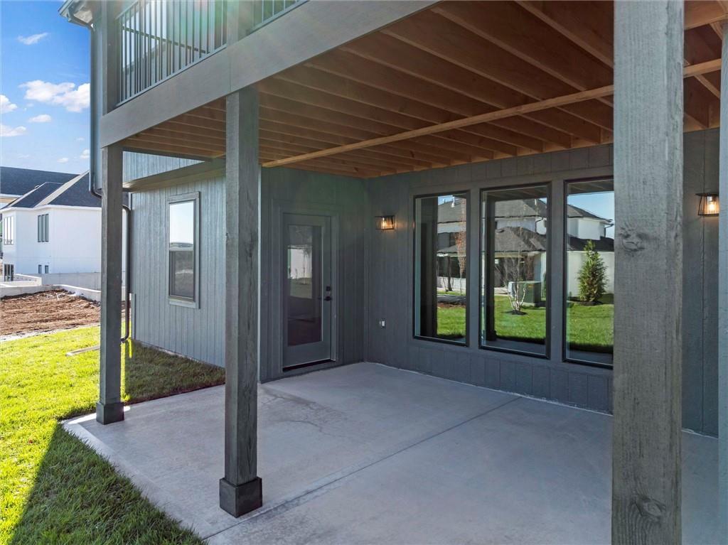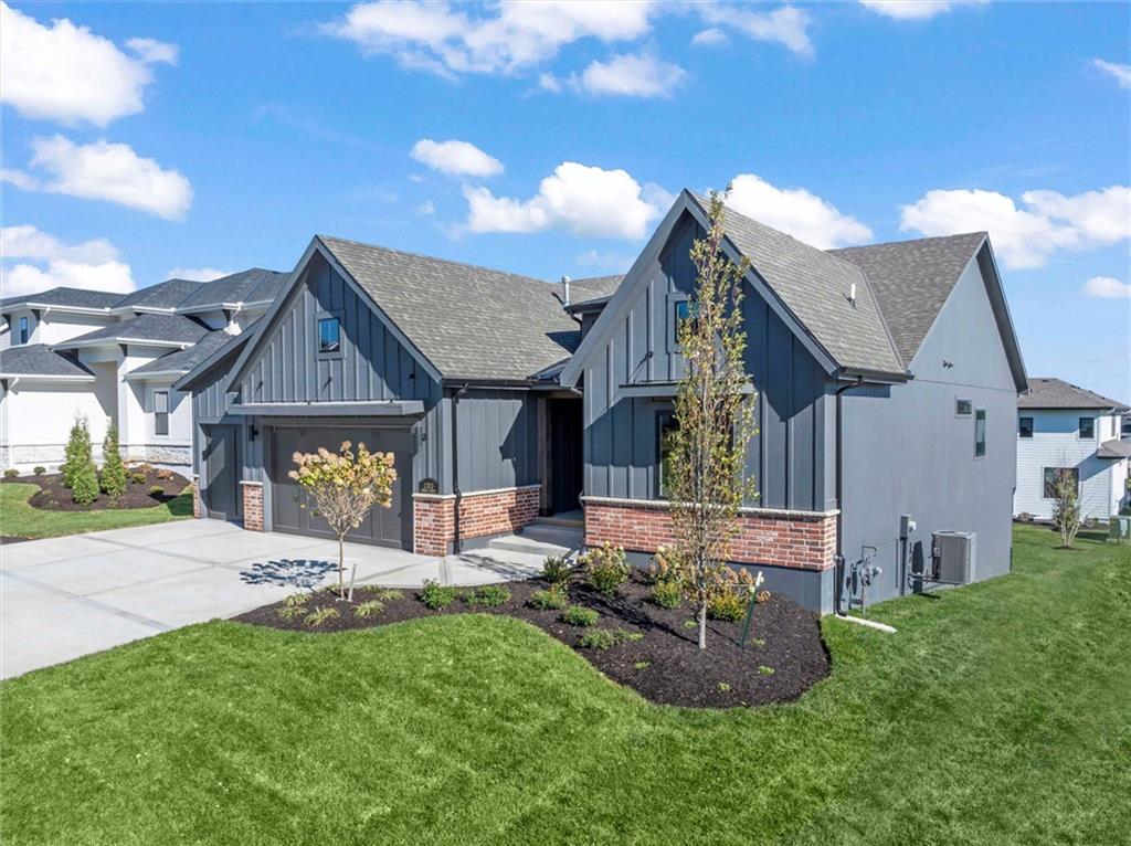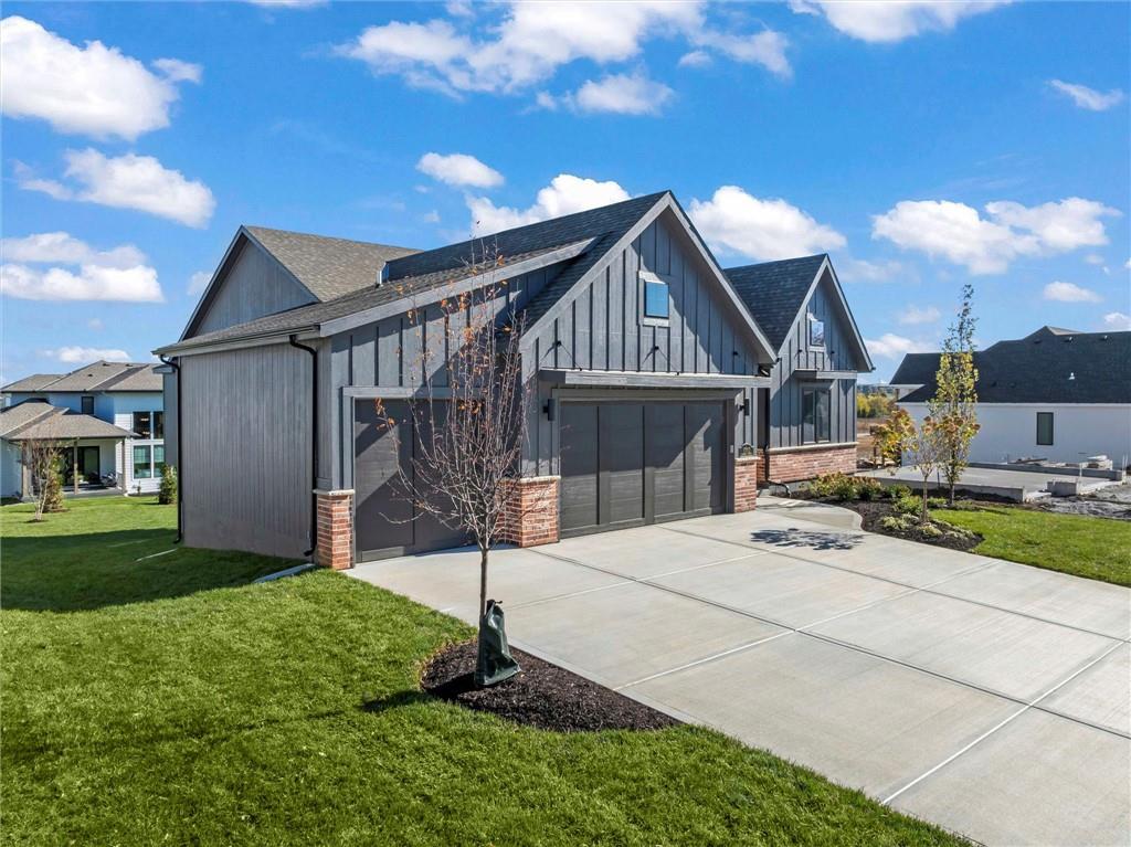 MOVE IN READY! The modern Riviera REVERSE by SAB Homes located on lot 184 in a cul-de-sac with a full finished walkout basement. You will love this new modern twist to a classic reverse floorplan at just over 3000 square-foot. with spectacular curb appeal featuring high peaks, vertical accent siding, metal accent roof, blackened bronzed windows, and super dark charcoal paint with red brick trim. Stunning! This home also features an ideal plan floor plan with a main floor primary suite and an office/ second bedroom with access to the covered 16' x 12' deck from the dining room and bedroom. Enjoy the finished walkout lower level with two more bedrooms, large family room with LVT flooring, parallel wet bar and a door to the backyard, plus plenty of room for storage. Perfect outdoor space under a 16' x 12' covered patio with full sod front and back, sprinkler system and front landscaping package included. This home is loaded with upgrades; gas cooktop, quartz countertops, decorative bath mirrors, Maxx Lounge freestanding tub, bump out in the dining area for hutch or china cabinet, boot bench at garage entry, large windows, floor to ceiling tile fireplace with accent ceiling trim in great room, vertical shiplap accent wall in the office with 3 ceiling beams, wainscoting at entry and stairwell and light wood flooring.  Century Farms has a spectacular club house with a farmhouse twist ideal for neighborhood gatherings or private parties with reading loft and a fitness center. There are plenty of neighborhood activities with a fire-pit, two pickle-ball courts and a basketball hoop, kids play area, wildflower walkways and a community garden. Century Farms is conveniently located near the brand new Bluhawk shopping center, Heritage Park, the Johnson County Trail system and the Overland Park Arboretum.  Come join the fun in Century Farms, a unique one of a kind upscale new home community in Overland Park. BLUE VALLEY SCHOOLS