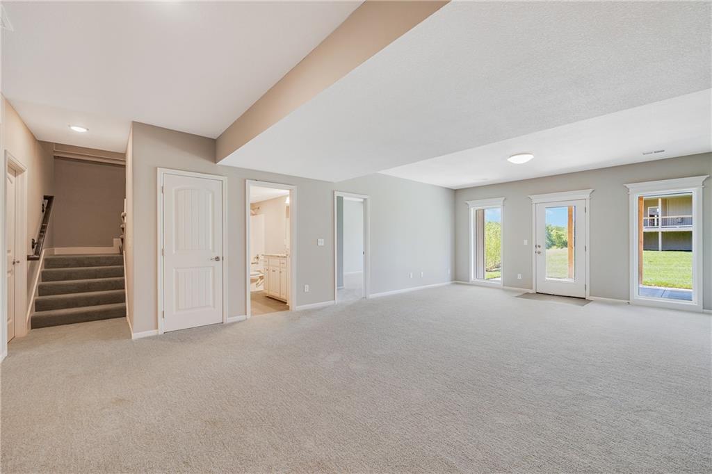 The Alpine by Hoffmann Custom Homes is a Reverse 1.5-story with an open, modern layout. The main floor features stylish, light wood engineered floors, a kitchen with white-and-gray granite countertops, stainless appliances, gas cooktop, built-in oven, and under-cabinet lighting. A gray mixed-stone fireplace with enameled wood trim accents anchors the great room, which opens to a covered deck for outdoor living. The primary suite includes a spacious walk-in closet and a private ensuite bath, finished with a beautifully coordinated tile. The lower level offers two bedrooms, a full bath, a large rec room with a granite wet bar, and walkout access to an oversized covered patio, green space, and two storage rooms. Quality meets innovation with solid 2x6 exterior wall construction, Pre-wired for easy solar panel installation, a 10-year structural warranty, built-in EV charging receptacle, and upgraded energy-efficient systems. The home is fully complete; photos represent the property as built.