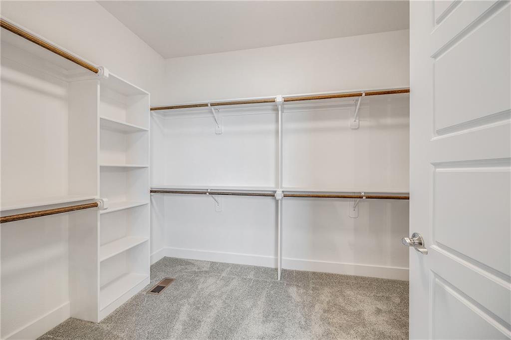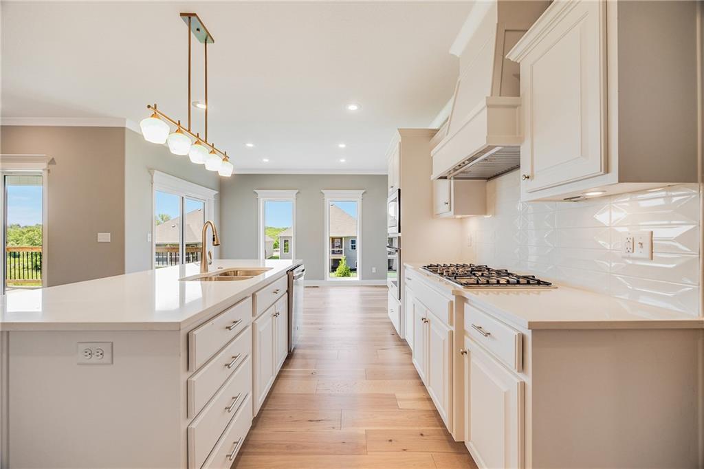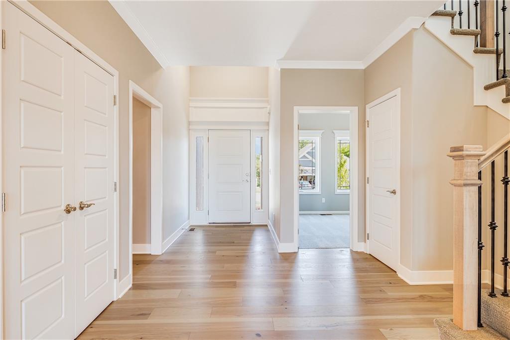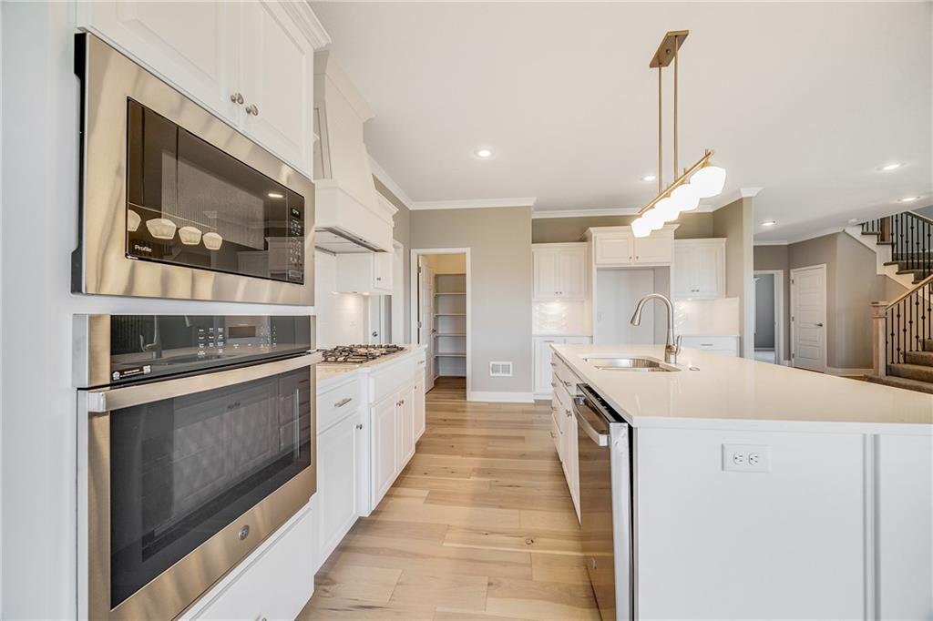 The Bentley by Hoffmann Custom Homes — an exclusive 1.5-story in Sara’s Meadow featuring 5 bedrooms, 3.5 baths, and a main-level office. Light engineered hardwood floors, creamy white cabinets, modern lighting, and an open kitchen with gas cooktop, built-in oven, microwave, and large island create a bright, cohesive main level. The great room showcases a stone fireplace with wood trim accents. The main-floor primary suite includes a freestanding tub, dual vanities, tiled shower, and walk-in closet. Upstairs offers 4 bedrooms with walk-in closets, a loft, and a second laundry room. The unfinished walk-out basement is plumbed for a future bath. Built with 2x6 exterior wall construction, Pre-wired for easy solar panel installation, and backed by a 10-year structural warranty, this home also includes an EV charger receptacle, whole-house humidifier, and energy-efficient features—all in a top-rated Northland school area. The home is fully complete; photos represent the property as built.
