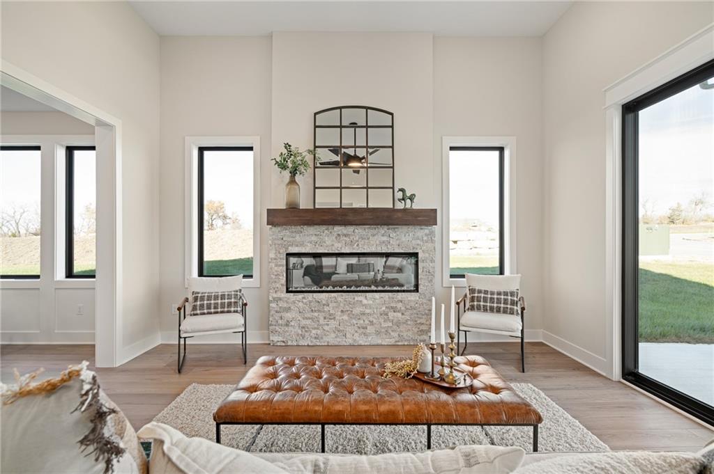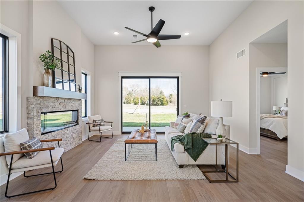 Discover modern, low-maintenance luxury living in this stunning 1.5-story villa featuring contemporary Elevation A with a modern garage door with glass panels and modern front door. Thoughtfully designed with the Primary Suite on the main level, this home offers an open, airy floor plan that seamlessly connects the Kitchen, Great Room, and outdoor patio—perfect for everyday living and entertaining. Upstairs, you'll find two spacious bedrooms with walk-in closets, a versatile loft area, and plenty of extra storage. Set in a one-of-a-kind community that blends residential comfort with walkable access to dining, shopping, and entertainment at Vista Village, this is more than a home—it’s a lifestyle. Enjoy top-tier amenities including a clubhouse with a pool, fitness center, entertainment space, pickleball courts, and a putting green. Monthly HOA dues cover the amenities, private streets, lawn care, and irrigation—providing ease and peace of mind year-round. Located in a prime Lenexa setting near Prairie Star Parkway and Ridgeview, you're just steps from scenic trails, minutes to Lenexa City Center, close to multiple golf courses, and have easy access to K-10 and I-435. HOME IS AT FINISH STAGE. Ask about our BUYER BONUS promotion. Now is the PERFECT time to pick your perfect villa & make selections. Taxes are estimated.