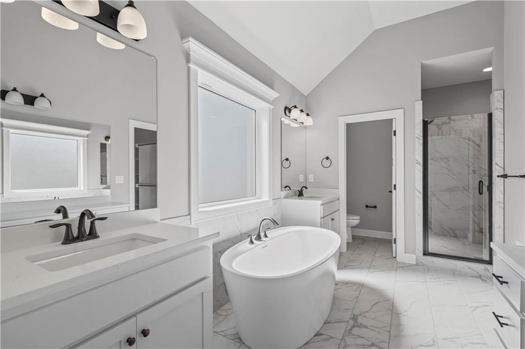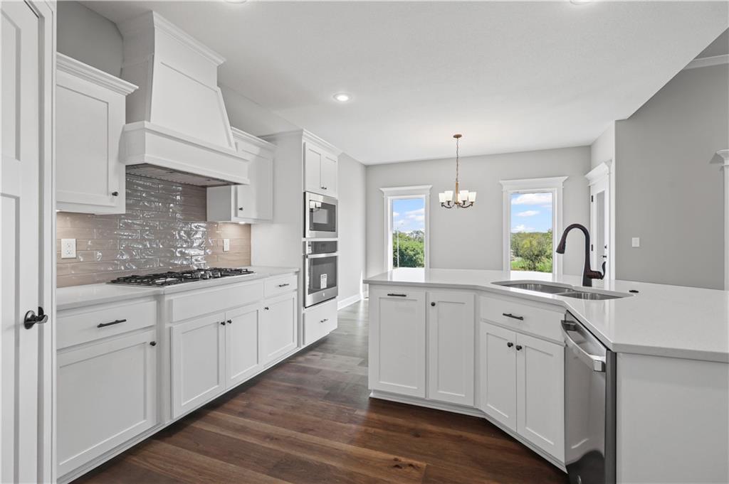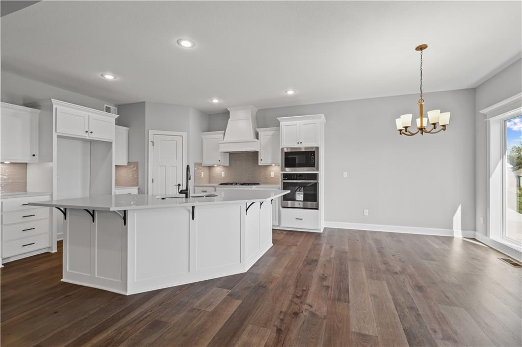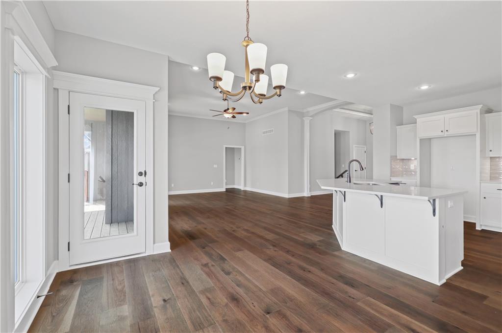 The Drake by Hoffmann Custom Homes is a Reverse 1.5-story home filled with natural light, high ceilings, and refined modern finishes. The main floor features dark engineered hardwood floors, a stylish kitchen with light granite countertops, dark hardware and faucets, gas cooktop, wall oven, enameled cabinets, and under-cabinet lighting. A modern gray stone fireplace with enameled wood trim accents warms the great room, which opens to a covered deck. The main level features the owner’s suite - complete with a free standing soaker tub, double split vanities, and a generous walk-in closet - plus a second bedroom or office, a full bath, and a convenient laundry room. The finished lower level adds two bedrooms, a full bath, a spacious rec room with a granite wet bar, and walkout access to a covered patio and oversized backyard. Engineered for modern living with 2x6 exterior wall construction, pre-wired for easy solar panel installation, a 10-year structural warranty, EV charger compatibility, and enhanced energy-saving features. The subdivision’s sales office is a Drake model, available to tour during office hours. The home is fully complete; photos represent the property as built.
