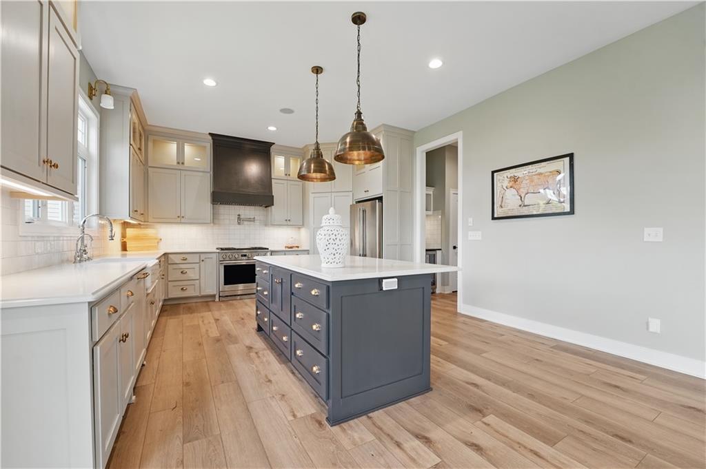 Award winning selections in Cedar Creek! Do you want a new home without the stress or the wait that goes with new construction? This is your chance! This is a rare opportunity to own an award-winning Gabriel Homes - Makenna 2 story that is less than 2 years old. Sitting on one of the best lots in Valley Ridge — backing to a beautiful, treed greenspace. It’s better than new, with the highest of finishes throughout! Step inside through the stunning double door entry into the main floor featuring 10-foot ceilings throughout. The main level office has been upgraded with custom built-ins along with double glass French doors. The expanded great room showcases a large gas fireplace with custom built-ins on either side, coffered ceiling treatment, and a wall of windows featuring upgraded wainscotting. The gourmet kitchen is every chef's dream, featuring beautiful floor to ceiling cabinets, a high end gourmet gas range, a huge walk-in pantry with a grocery pass-through, and an expanded island, perfect for entertaining. Off the main living area, you’ll find a covered deck that looks out over the trees, ideal for your morning coffee or evening relaxation. Upstairs, the primary suite is absolutely incredible. It’s oversized with a huge walk-in closet and has a bonus closet perfect for seasonal clothing or secure storage. The primary suite bathroom feels like your very own spa with heated tile floors, double vanities, a luxurious soaker tub, and a large shower with his and her sides. Every detail on this home has been meticulously selected! Cedar Creek features a 65 acre private fishing/canoeing/kayaking lake. 3 resort-like swimming pools, a 2 story clubhouse with NBA basketball grade court that is also set up for year round pickleball or volleyball, several outdoor tennis and pickleball courts, sand volleyball court, along with miles of walking trails! Come see why Cedar Creek is one of the most sought-after communities to call home in Johnson County!